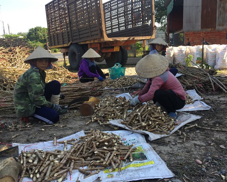 Nhân công chặt hom giống mì tại một điểm bán giống cây mì ở xã Tân Phú, huyện Tân Châu.