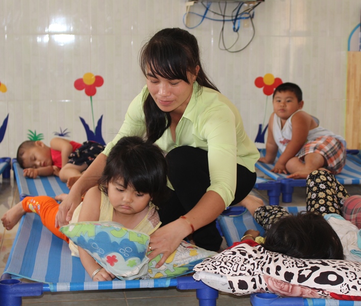 Giờ nghỉ trưa của trẻ mầm non tại Khu dân cư Chàng Riệc, xã Tân Lập, huyện Tân Biên. Ảnh: Việt Đông.