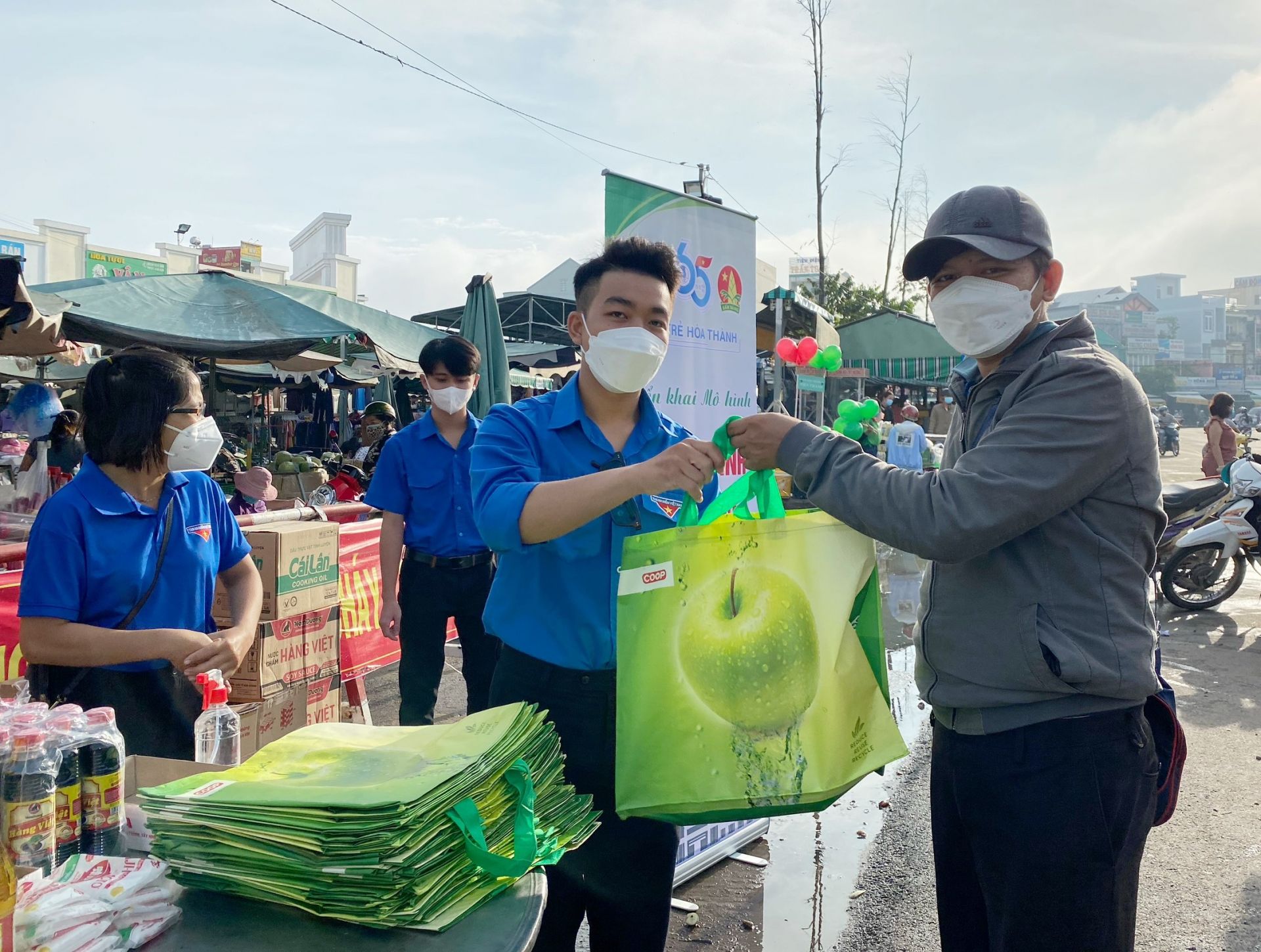 Đoàn viên thanh niên thị xã Hoà Thành tặng túi thân thiện với môi trường cho người đi chợ. Ảnh minh hoạ K.K