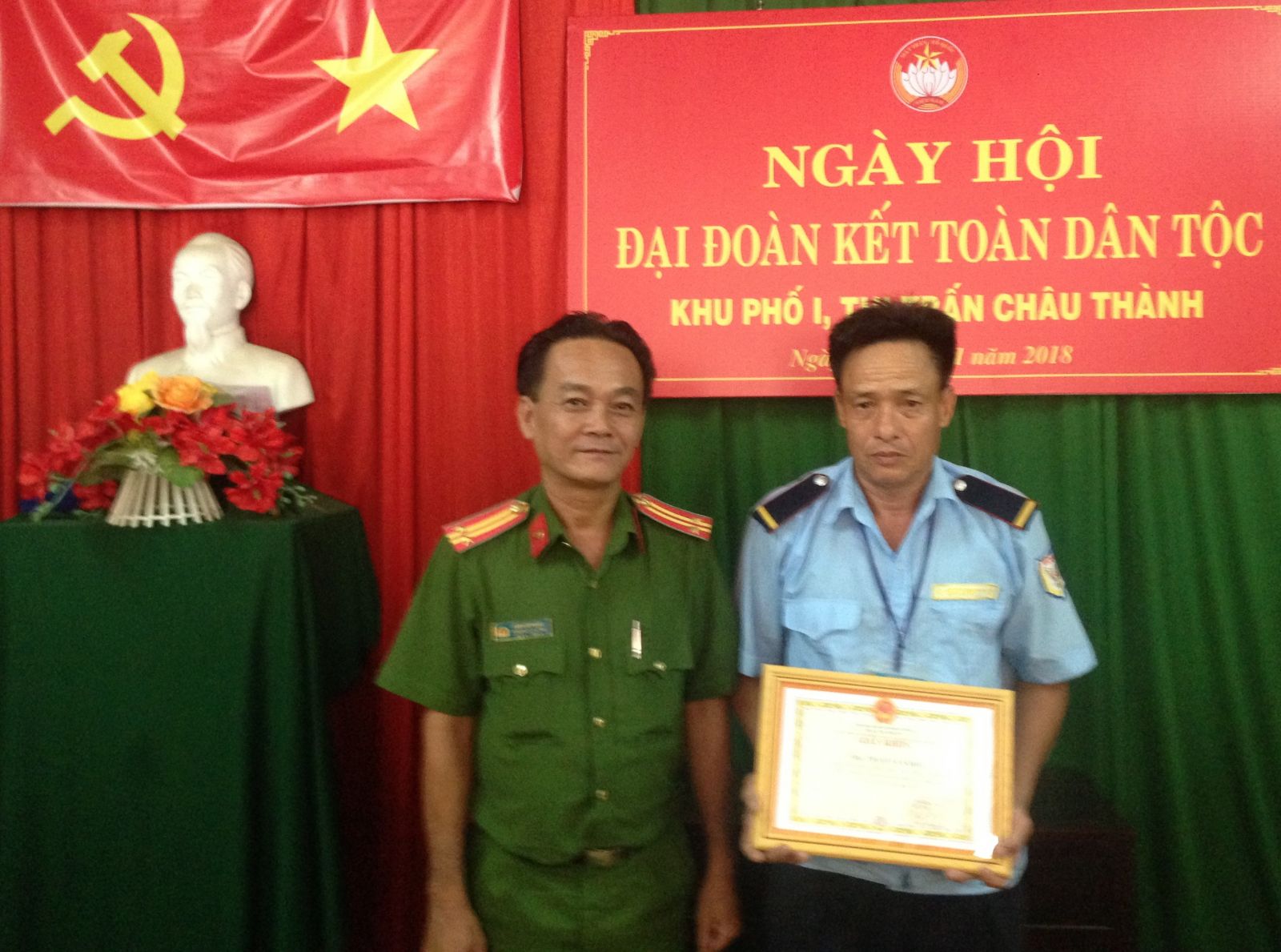 Ngày 10.11, Công an thị trấn Châu Thành trao giấy khen và phần thưởng của Chủ tịch UBND huyện Châu Thành cho anh Trần Thanh Tiền (SN 1986, ngụ ấp Suối Dộp, xã Thái Bình) và anh Phạm Văn Hoà (SN 1963, ngụ ấp Tua Hai, xã Ðồng Khởi), là nhân viên bảo vệ Trung tâm Y tế huyện Châu Thành có thành tích bắt được đối tượng trộm cắp tài sản khi đang làm nhiệm vụ.