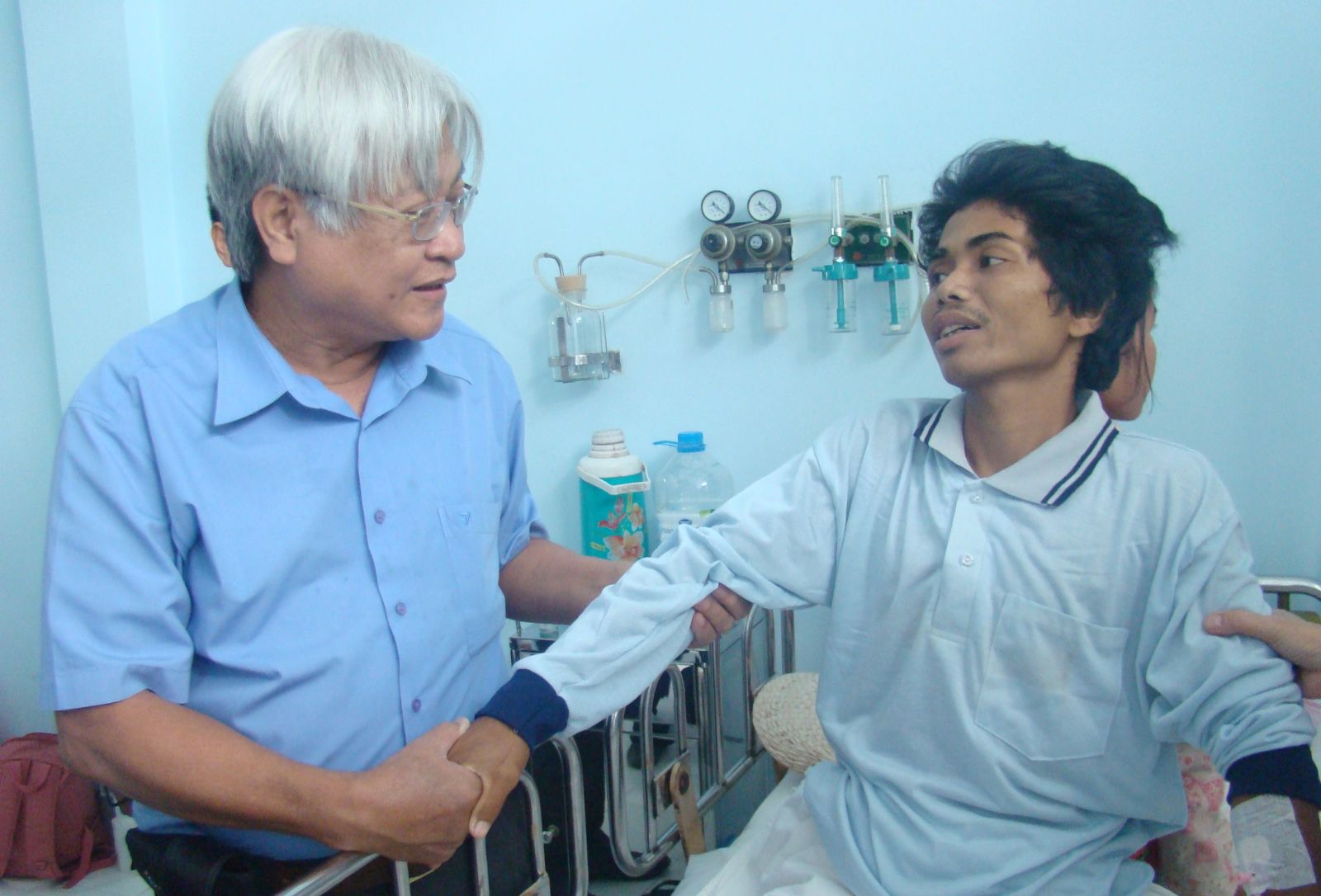 Phó Giáo sư Võ Văn Thành- chuyên gia đầu ngành về cột sống thăm hỏi bệnh nhân sau khi được ông tiến hành ca mổ tại Bệnh viện Ða khoa Tây Ninh.