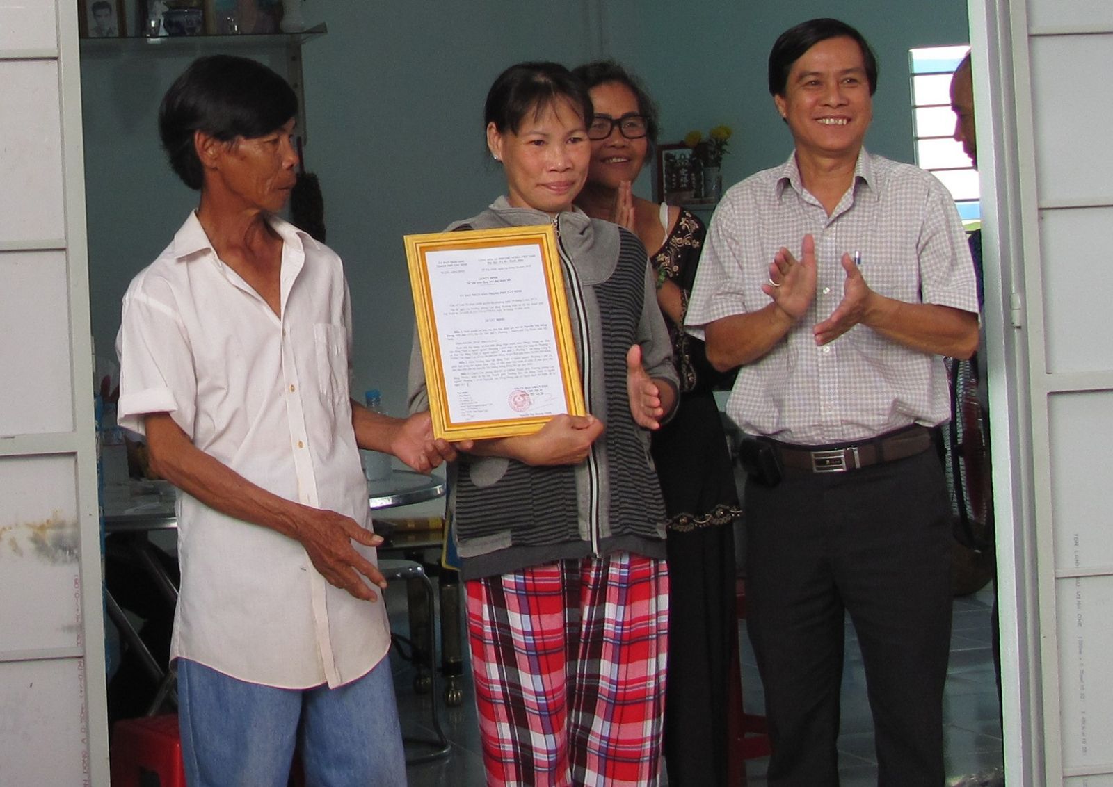 Lãnh đạo phường 1 trao quyết định sở hữu căn nhà cho bà Dung. Ảnh: Phương Ngân