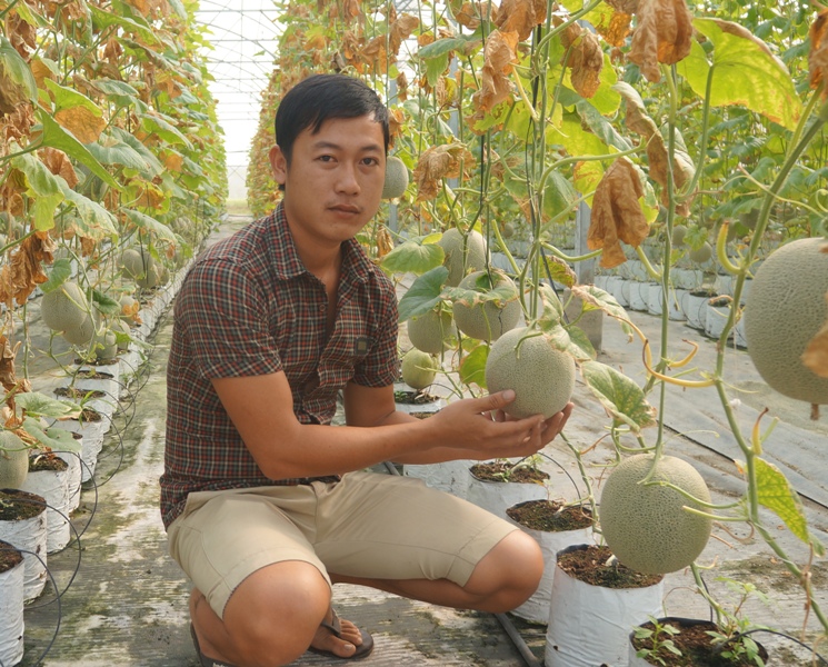 Anh Lê Tấn Tới bên vườn dưa lưới.