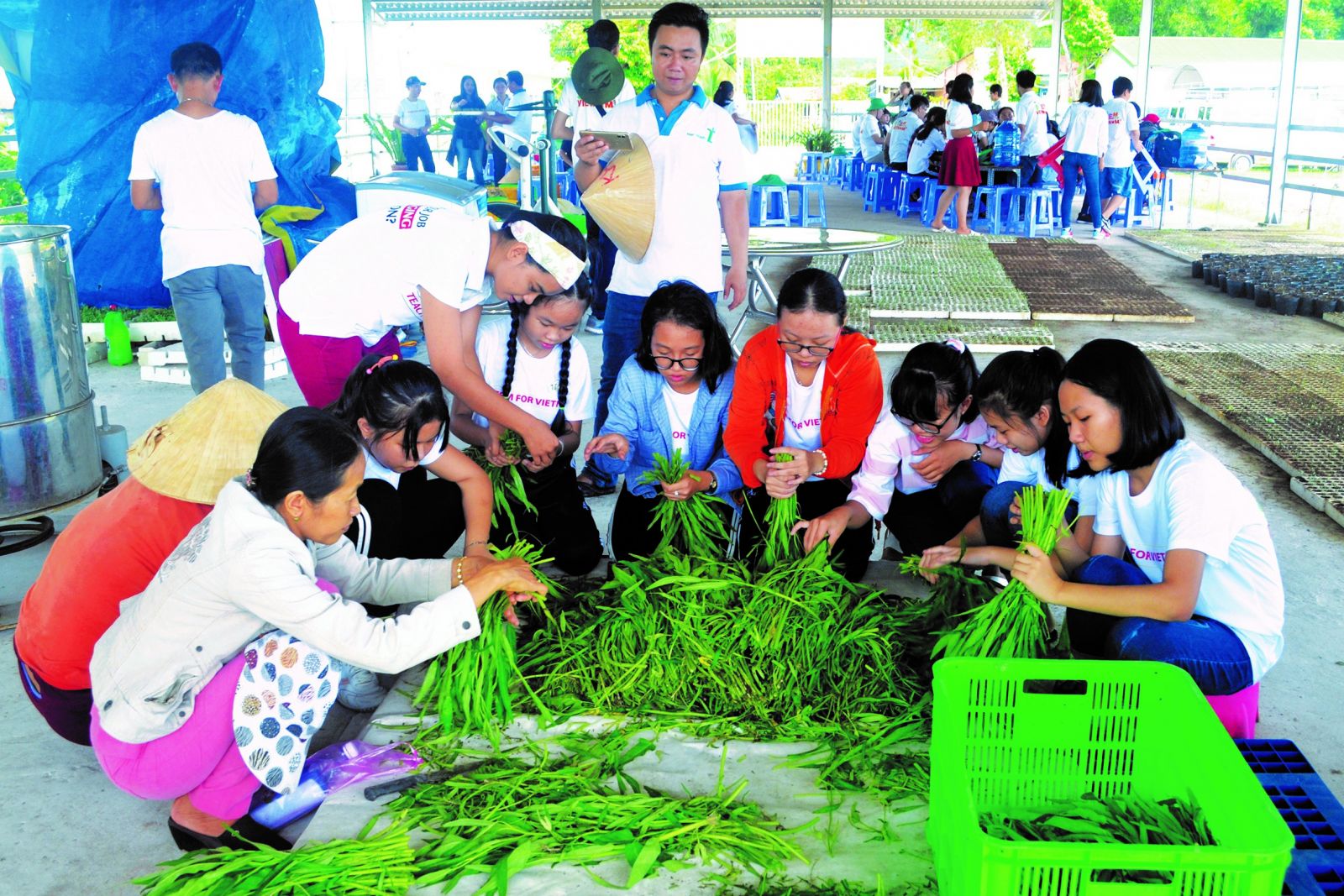 Nhóm học sinh thực hành sơ chế rau trong một chuyến thực tế trải nghiệm tại nông trại Nam Trạng.