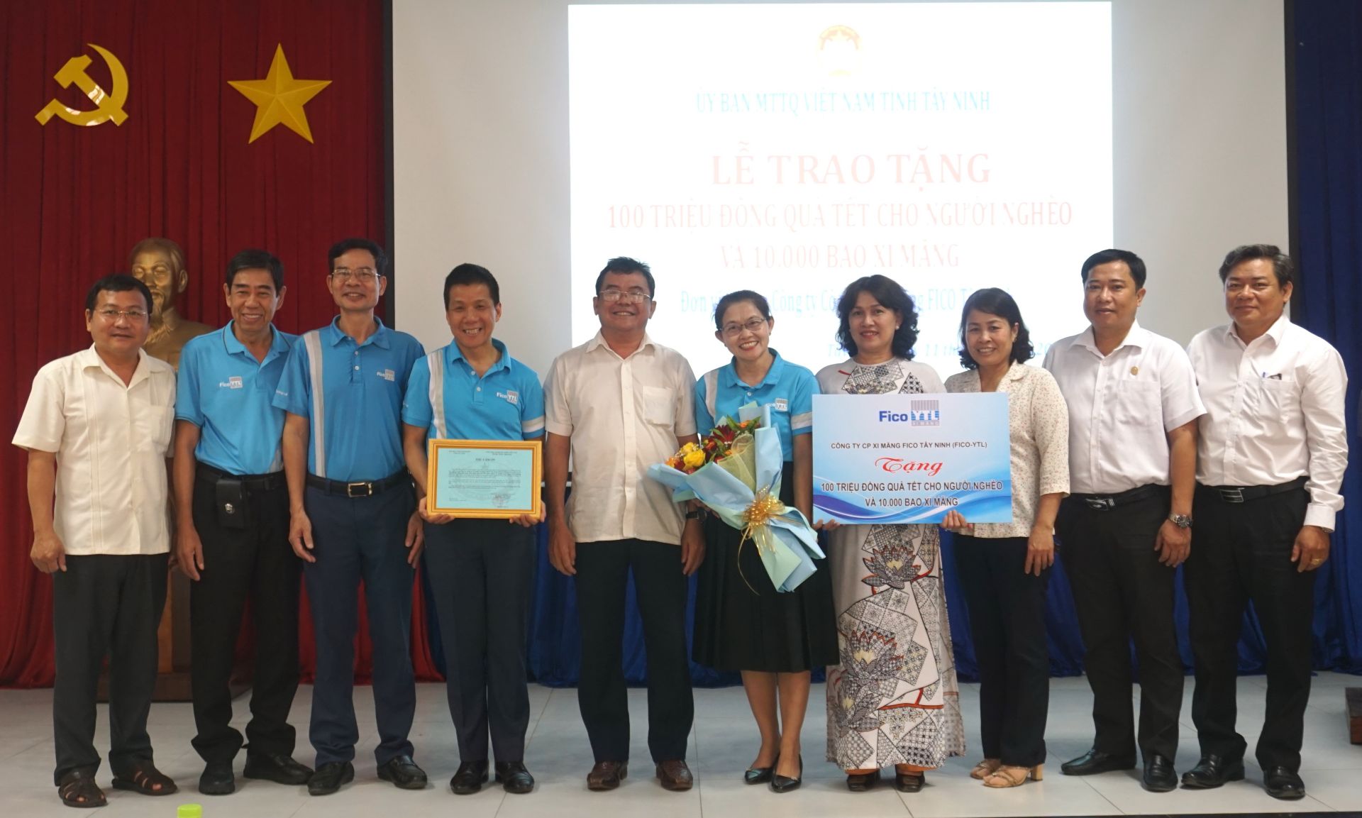 Đại diện Công ty cổ phần xi măng Fico Tây Ninh trao 100 triệu đồng ủng hộ quà tết cho hộ nghèo, cận nghèo và 10.000 bao xi măng hỗ trợ xây tặng 100 căn nhà đại đoàn kết tại hai huyện Tân Châu và Tân Biên. Tổng giá trị hỗ trợ 1 tỷ đồng.