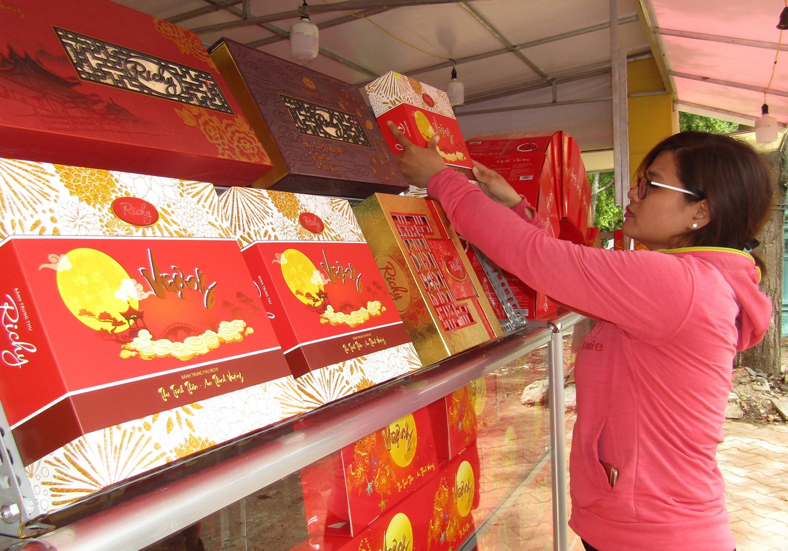 Khách hàng lựa chọn bánh trung thu Richy tại một quầy bánh trên đường 30.4 (TP. Tây Ninh).