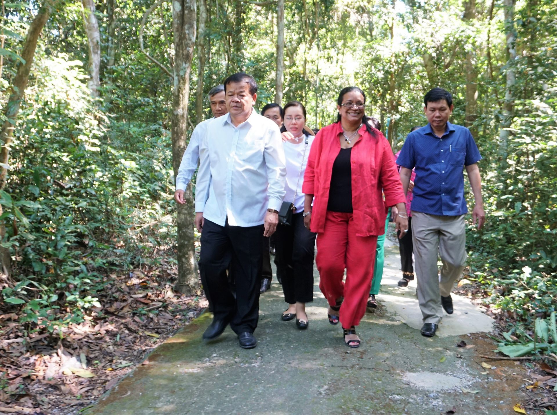 Chủ tịch UBND tỉnh Phạm Văn Tân và Ðoàn Tổng lãnh sự Cuba trên đường vào thăm Căn cứ Chính phủ cách mạng lâm thời Cộng hoà miền Nam Việt Nam.