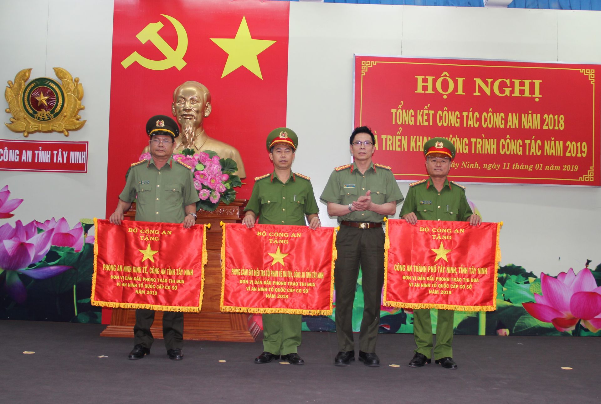 Ðại tá Nguyễn Tri Phương- Giám đốc Công an tỉnh trao cờ thi đua của Bộ Công an cho 3 đơn vị xuất sắc.