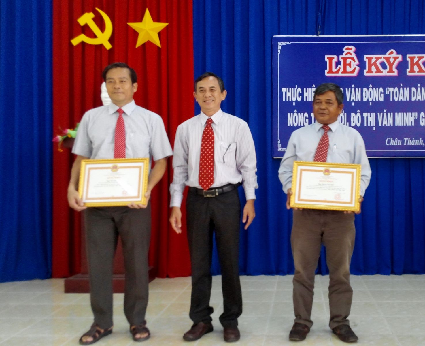 Sáng 11.8, ông Nguyễn Hữu Ngân- Phó Giám đốc Sở Nội vụ, Phó Chủ tịch Thường trực Hội đồng Thi đua - Khen thưởng tỉnh đã trao Bằng khen của Chủ tịch UBND tỉnh cho ông Võ Văn Tươi- Chủ tịch UBMTTQVN huyện Châu Thành và ông Trần Văn Việt- nhà thầu xây dựng vì có sáng kiến xây dựng nhà đại đoàn kết cho hộ nghèo trên địa bàn huyện Châu Thành.
