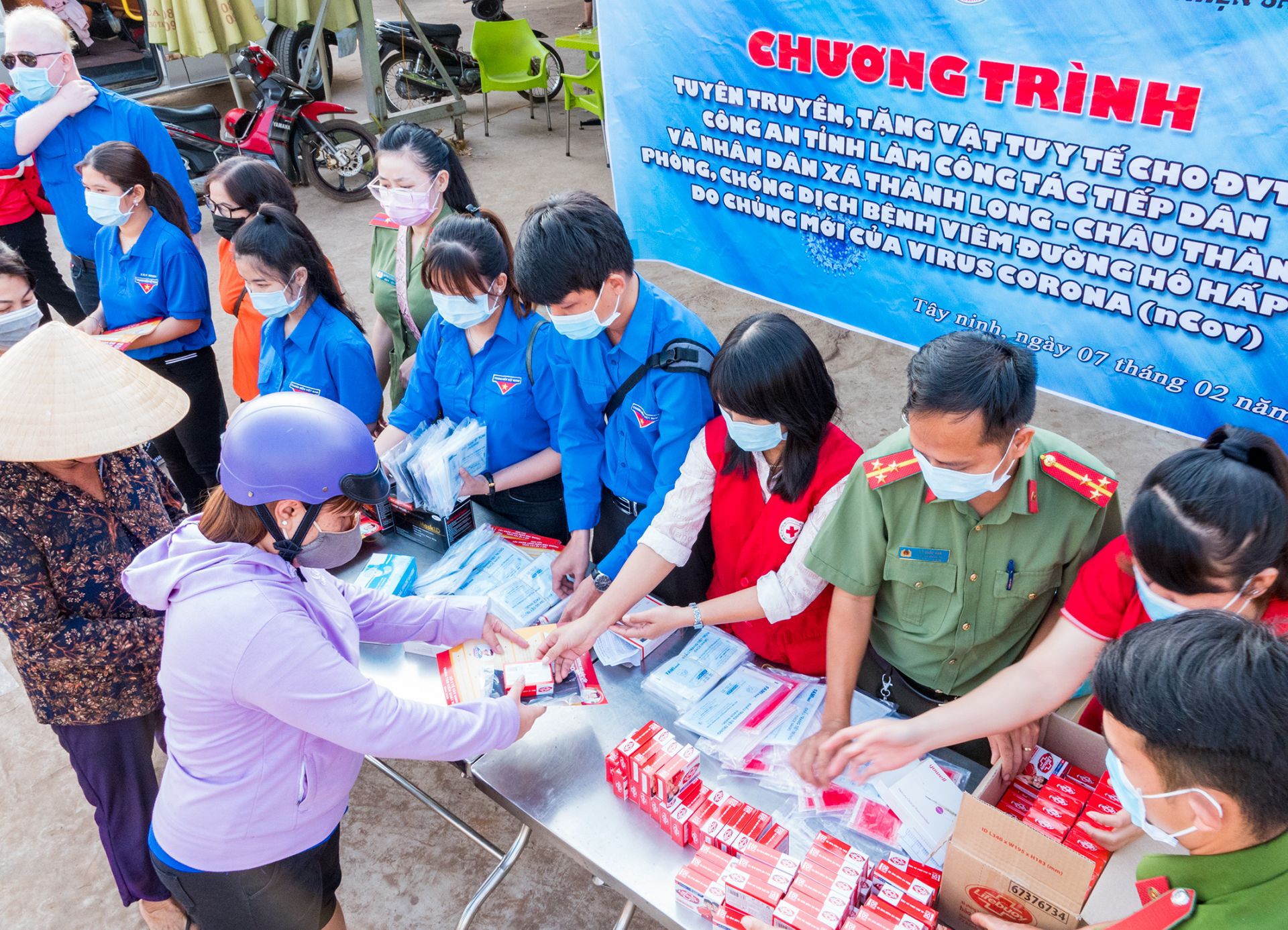 Đoàn viên thanh niên Công an tỉnh tặng khẩu trang y tế và xà phòng sát khuẩn cho người dân xã Thành Long, huyện Châu Thành. Ảnh: Đỗ Thành Nhân