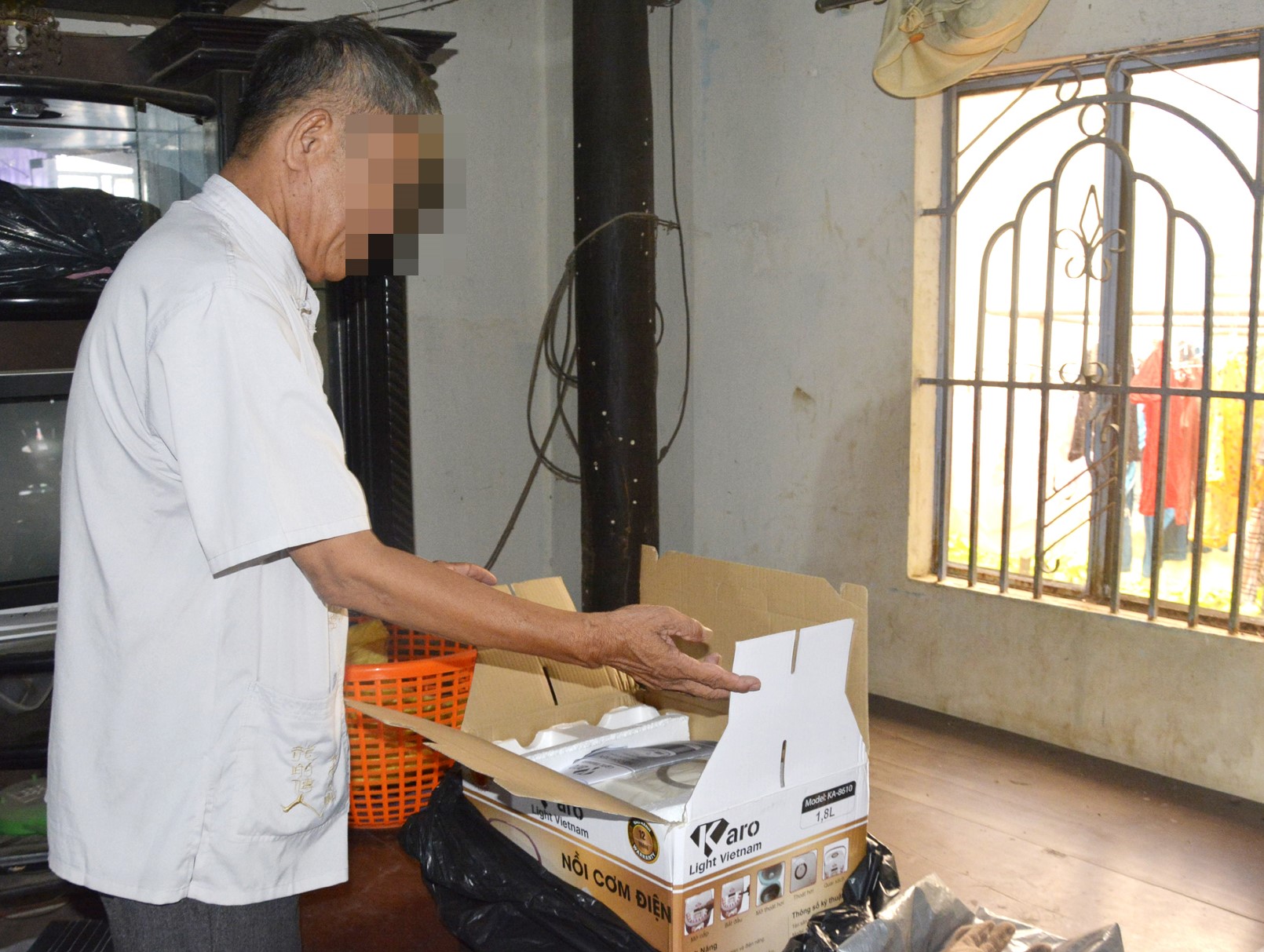 Một người dân xã Long Khánh, huyện Bến Cầu mua nhiều thiết bị điện tử giá cao khi tham gia “tour du lịch 0 đồng” do Công ty TNHH Ishiba tổ chức.