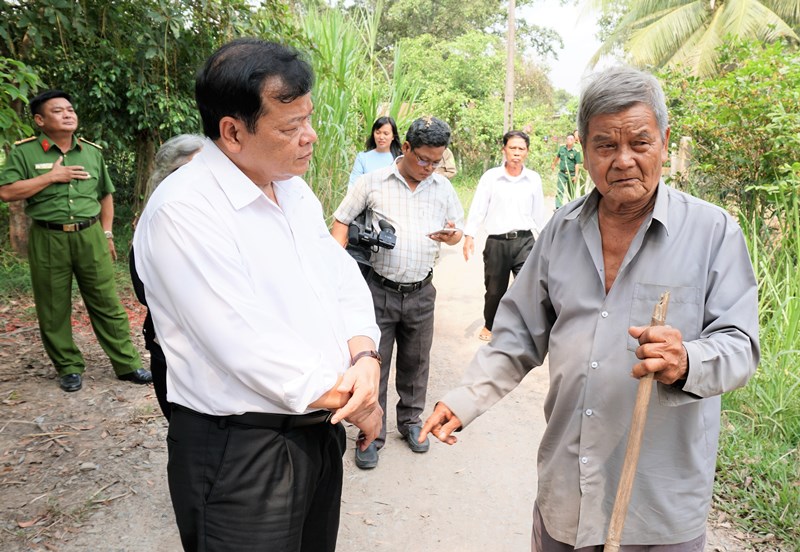 Chủ tịch UBND tỉnh Phạm Văn Tân (bên trái) gặp gỡ người dân địa phương để tìm hiểu về hoạt động của Chi bộ Rạch Tràm- Phước Chỉ.