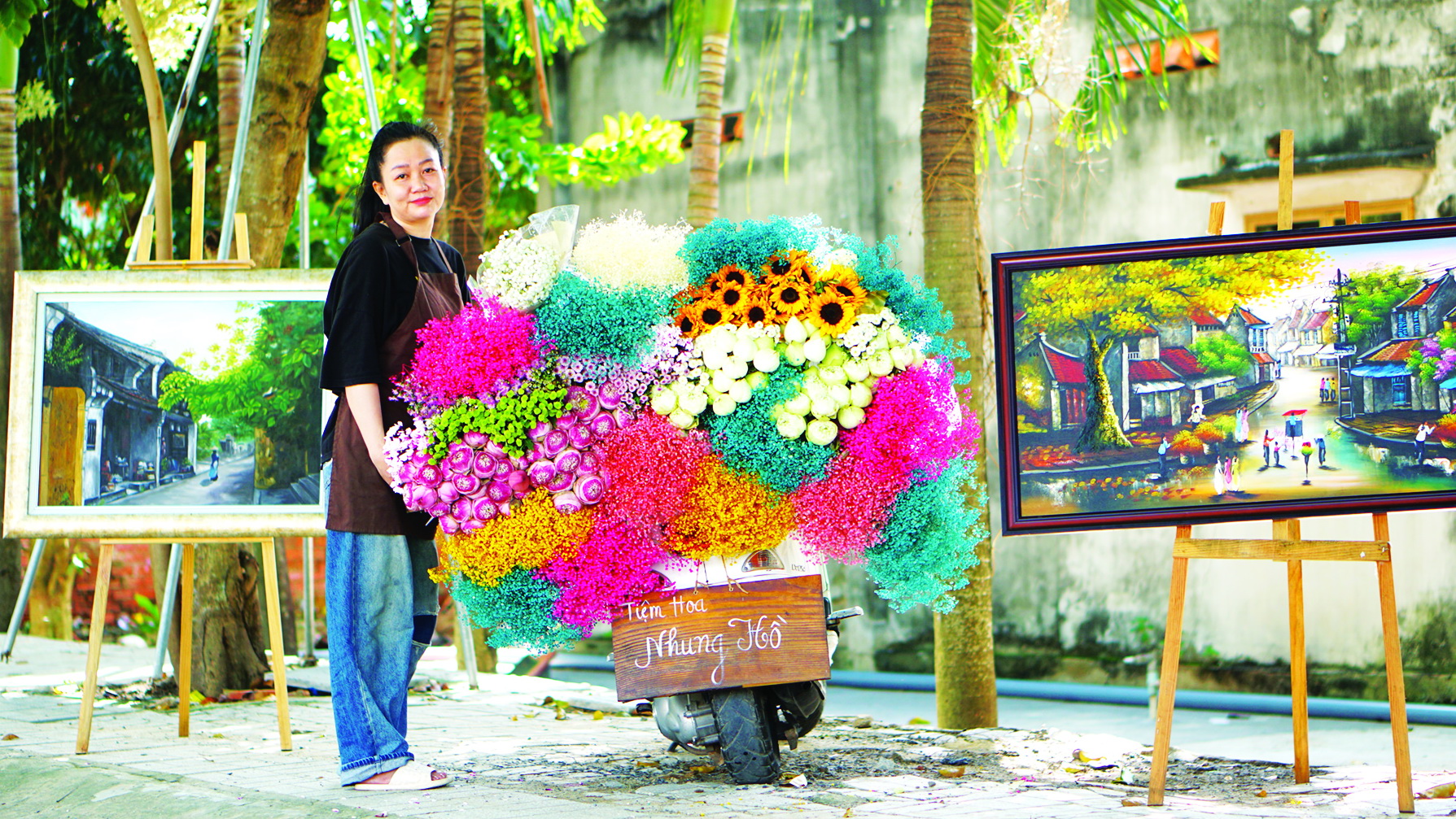 Cô chủ cửa hàng hoa Nhung Hồ bên những sản phẩm hoa do mình thiết kế, được bố trí trên đường 30.4, khu phố Gia Huỳnh.