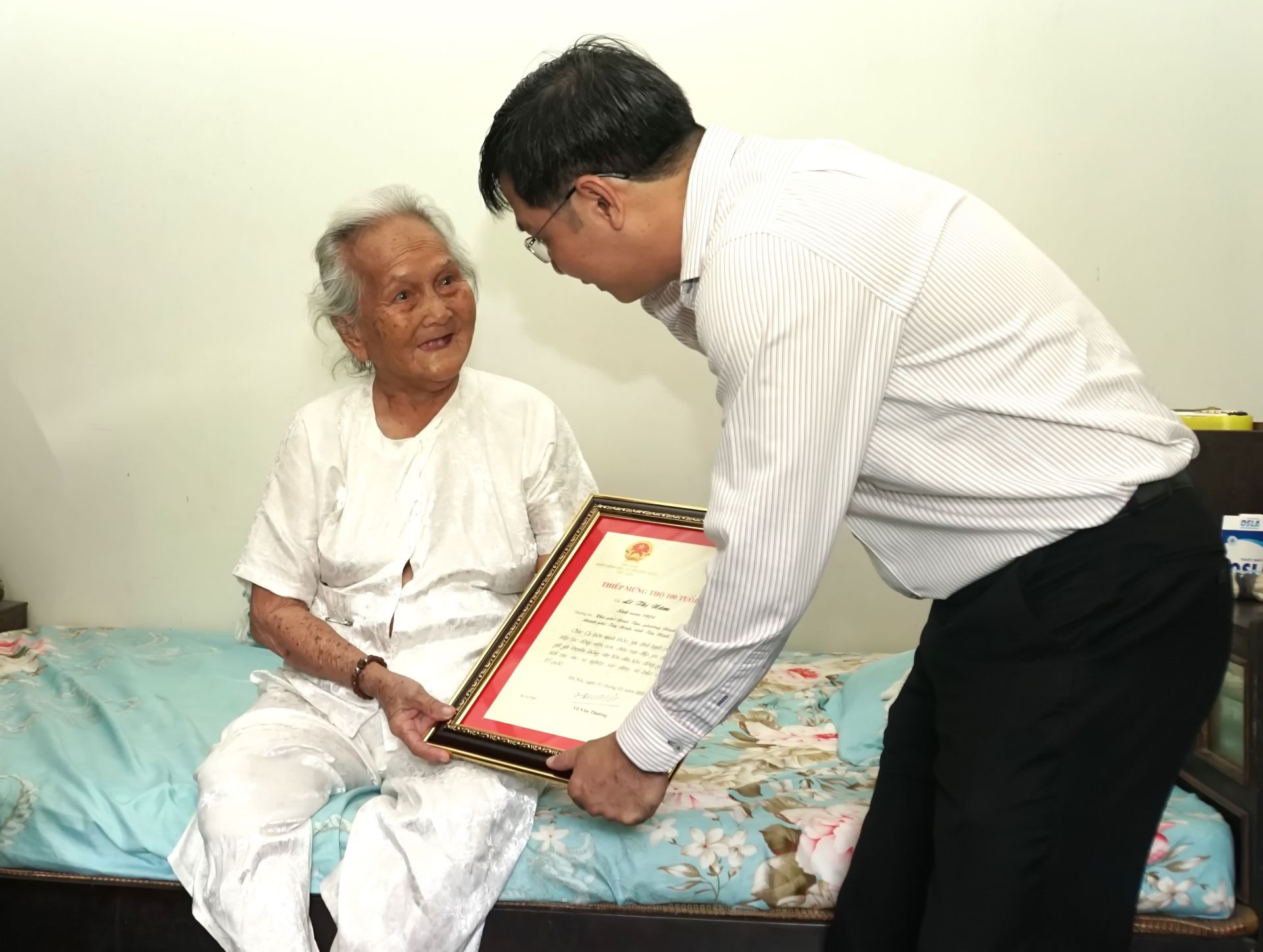 Bí thư Tỉnh uỷ, Chủ tịch HĐND tỉnh Nguyễn Thành Tâm trao thiệp mừng thọ 100 tuổi của Chủ tịch nước cho cụ bà Lê Thị Năm (khu phố Ninh Tân, phường Ninh Sơn, TP. Tây Ninh.