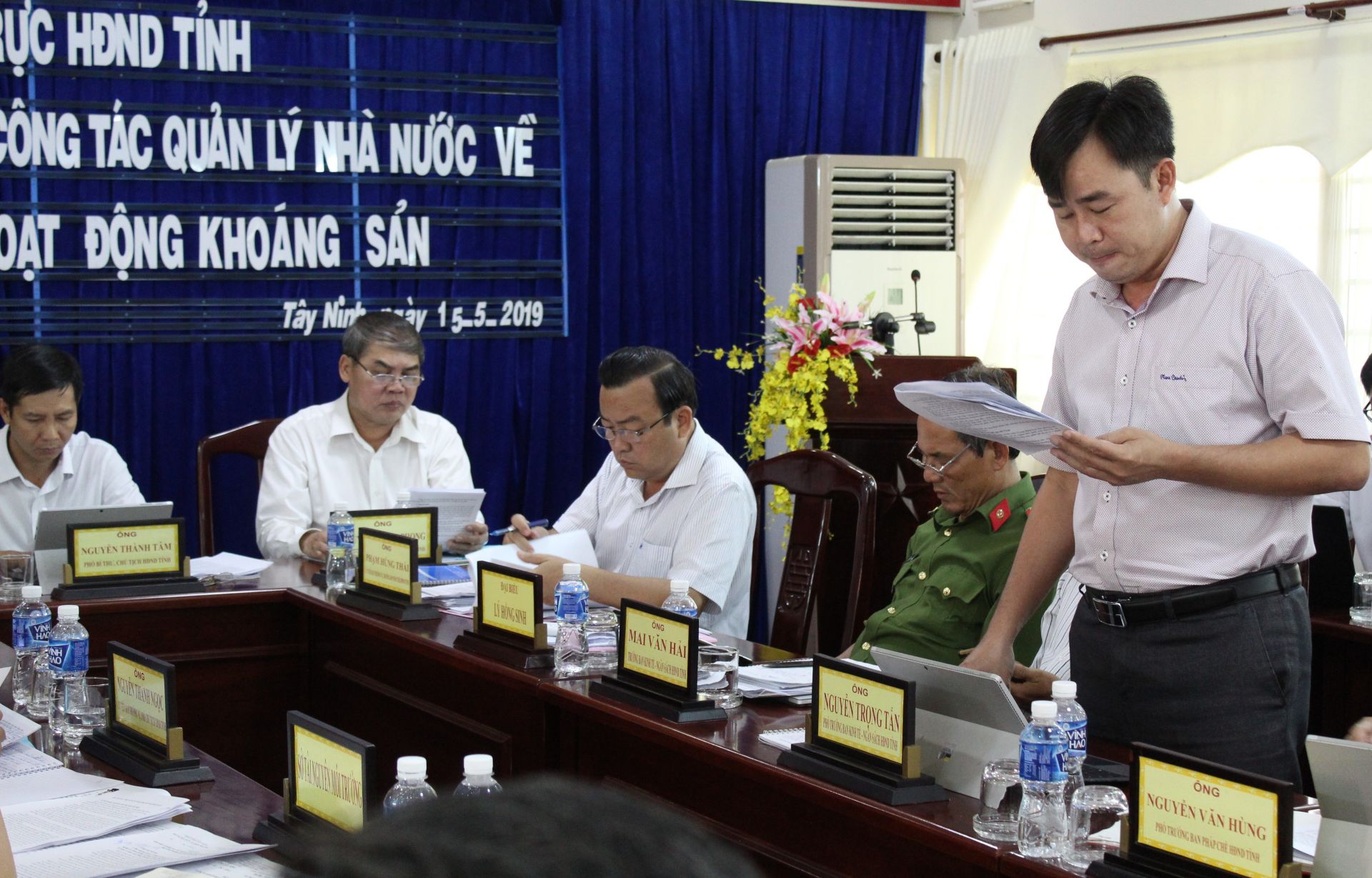 Ông Nguyễn Trọng Tấn - Phó trưởng Ban Kinh tế - Ngân sách HĐND tỉnh trình bày báo cáo kết quả khảo sát hoạt động khai thác khoáng sản tại buổi giám sát UBND tỉnh.