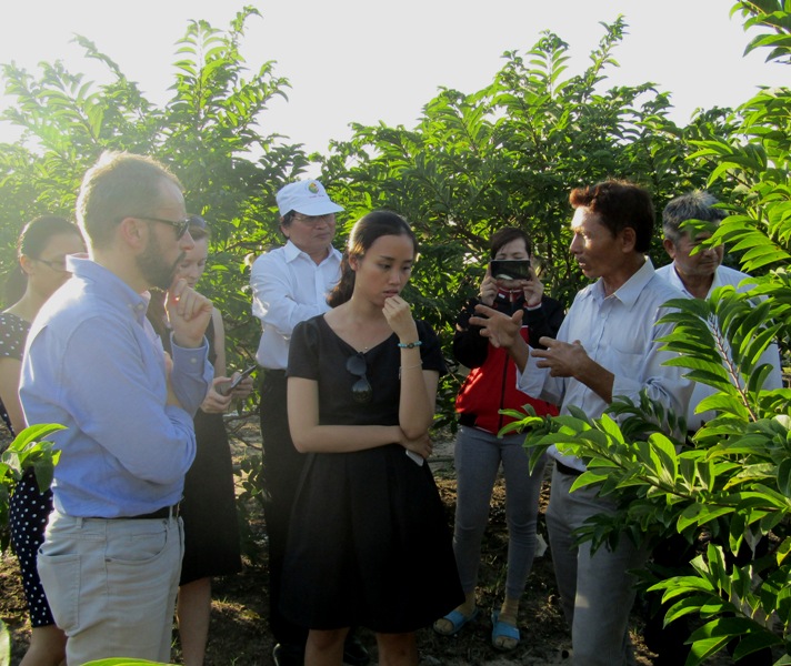 Đại diện tập đoàn United Technologies đến khảo sát vườn mãng cầu của ông Huỳnh Biển Chiêu (xã Tân Hưng, huyện Tân Châu) trong đợt khảo sát về phát triển chuỗi cung ứng lạnh cho chuỗi giá trị nông nghiệp tại Tây Ninh.