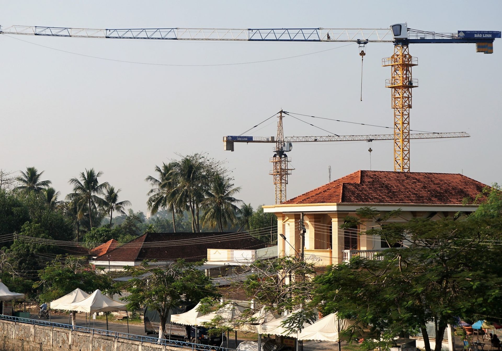 Hai cần cẩu sắt to tướng lơ lửng trên không trung, khiến những gia đình làm ăn sinh sống bên dưới không khỏi lo sợ.