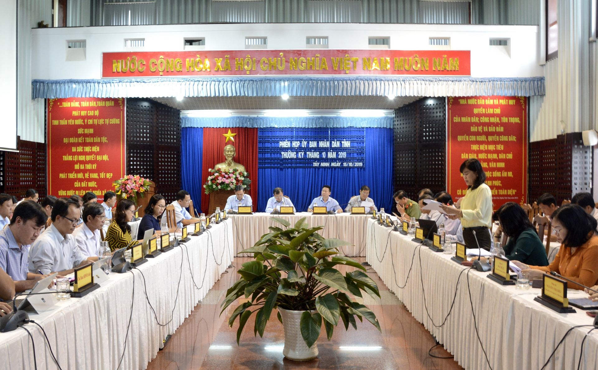 Chiều 15.10, Chủ tịch UBND tỉnh Phạm Văn Tân cùng các Phó Chủ tịch Nguyễn Thanh Ngọc, Dương Văn Thắng, Trần Văn Chiến chủ trì phiên họp thường kỳ tháng 10.2019. Tại kỳ họp, 3 nội dung được lấy ý kiến gồm: chính sách hỗ trợ đối với người hoạt động không chuyên trách cấp xã và ấp, khu phố trên địa bàn tỉnh; chính sách hỗ trợ đối tượng thuộc hộ gia đình không có khả năng thoát nghèo; quy định hệ số K điều chỉnh giá đất để tính tiền sử dụng đất đối với nhà ở riêng lẻ có khả năng sinh lợi cao ở vị trí mặt đường khi bán nhà ở có thuộc sở hữu nhà nước trên địa bàn tỉnh.