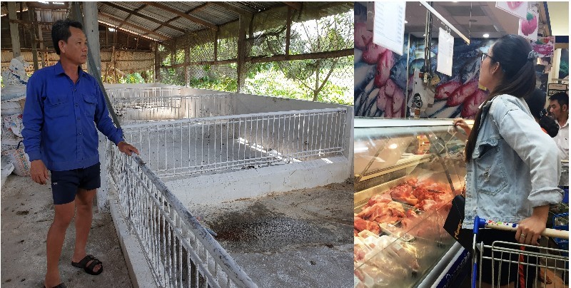 Nông dân tiếc vì chuồng heo bỏ trống mà không dám tái đàn. Ảnh: Minh Dương (bên trái) và Người dân mua thịt heo tại siêu thị Co.opMart. Ảnh: Vũ Nguyệt
