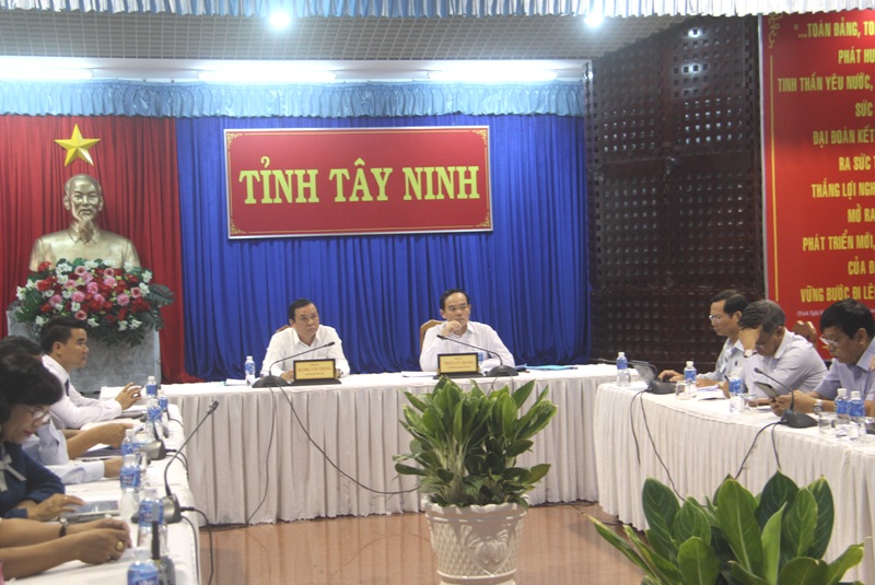 Ðiều hành hội nghị tại điểm cầu Tây Ninh có Bí thư Tỉnh uỷ Trần Lưu Quang, Phó Chủ tịch UBND tỉnh Dương Văn Thắng.