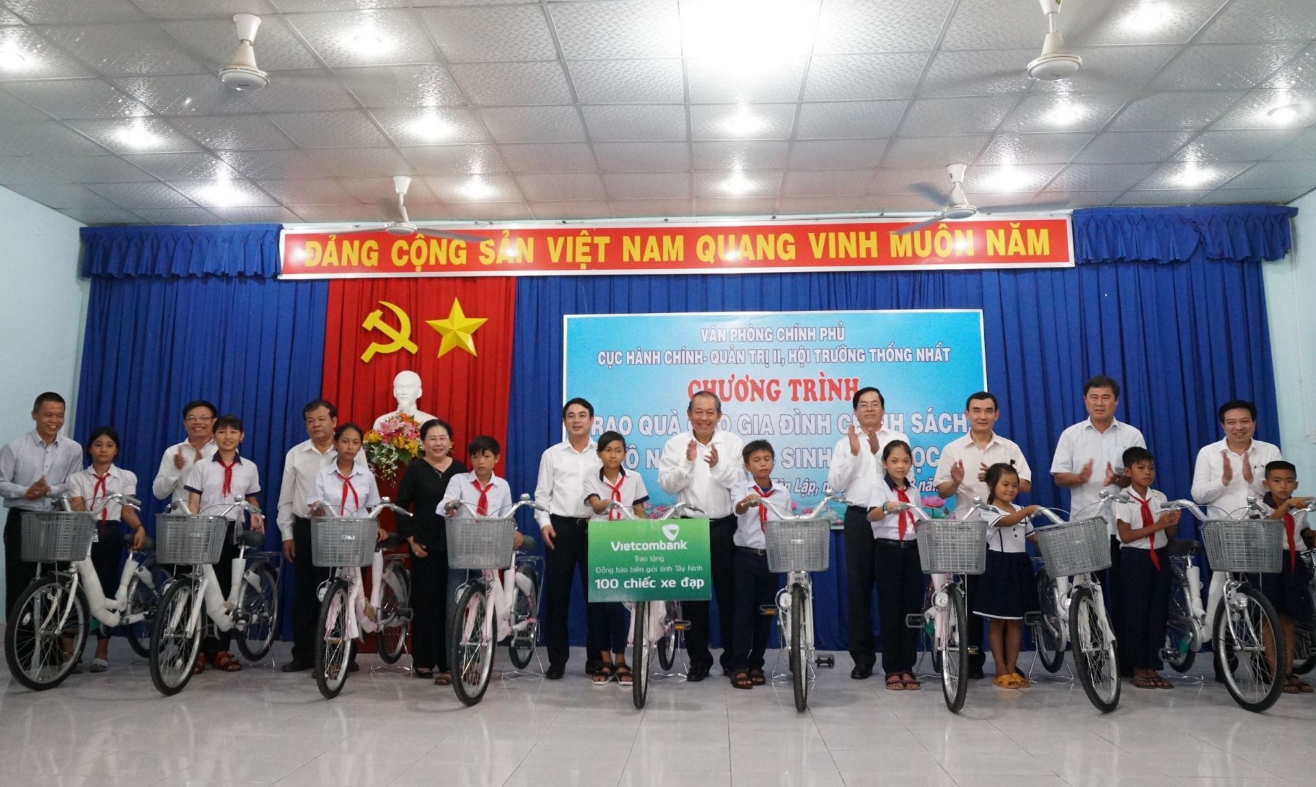 Phó Thủ tướng Thường trực Chính phủ Trương Hoà Bình trao xe đạp cho học sinh.