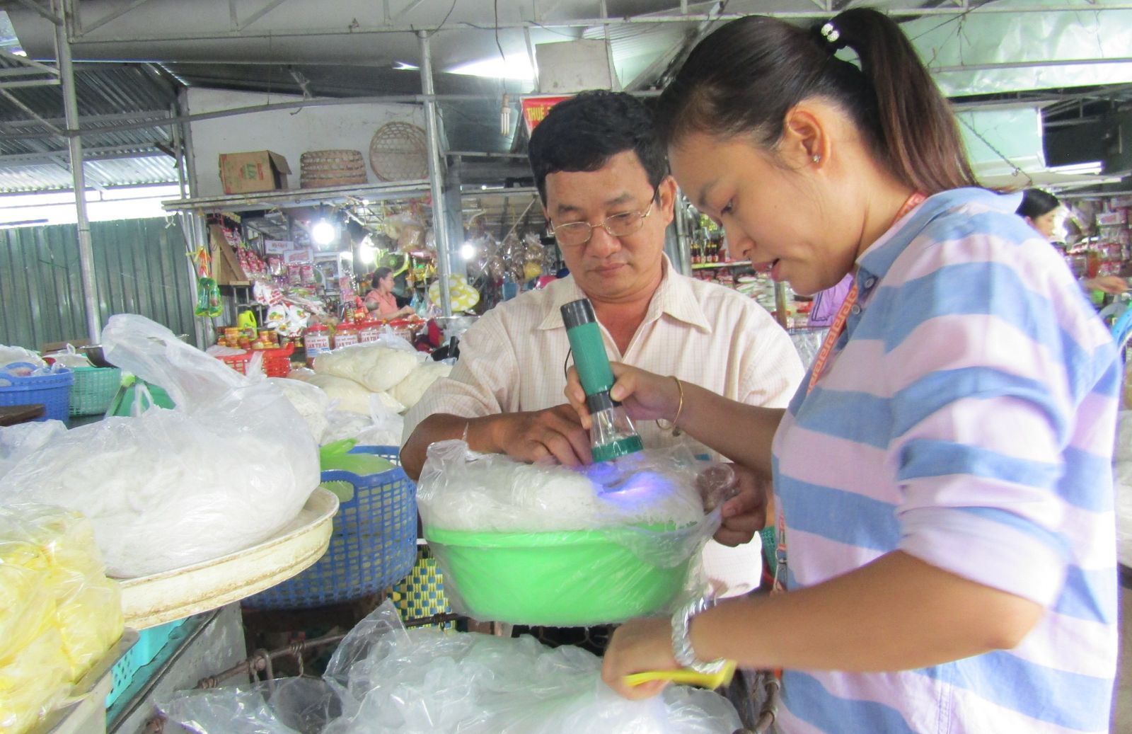 Chuyên viên thanh tra thuộc Chi cục ATVSTP test nhanh Tinopal trên bánh hỏi của các cơ sở kinh doanh bún tươi, bánh hỏi ở chợ Long Hoa.