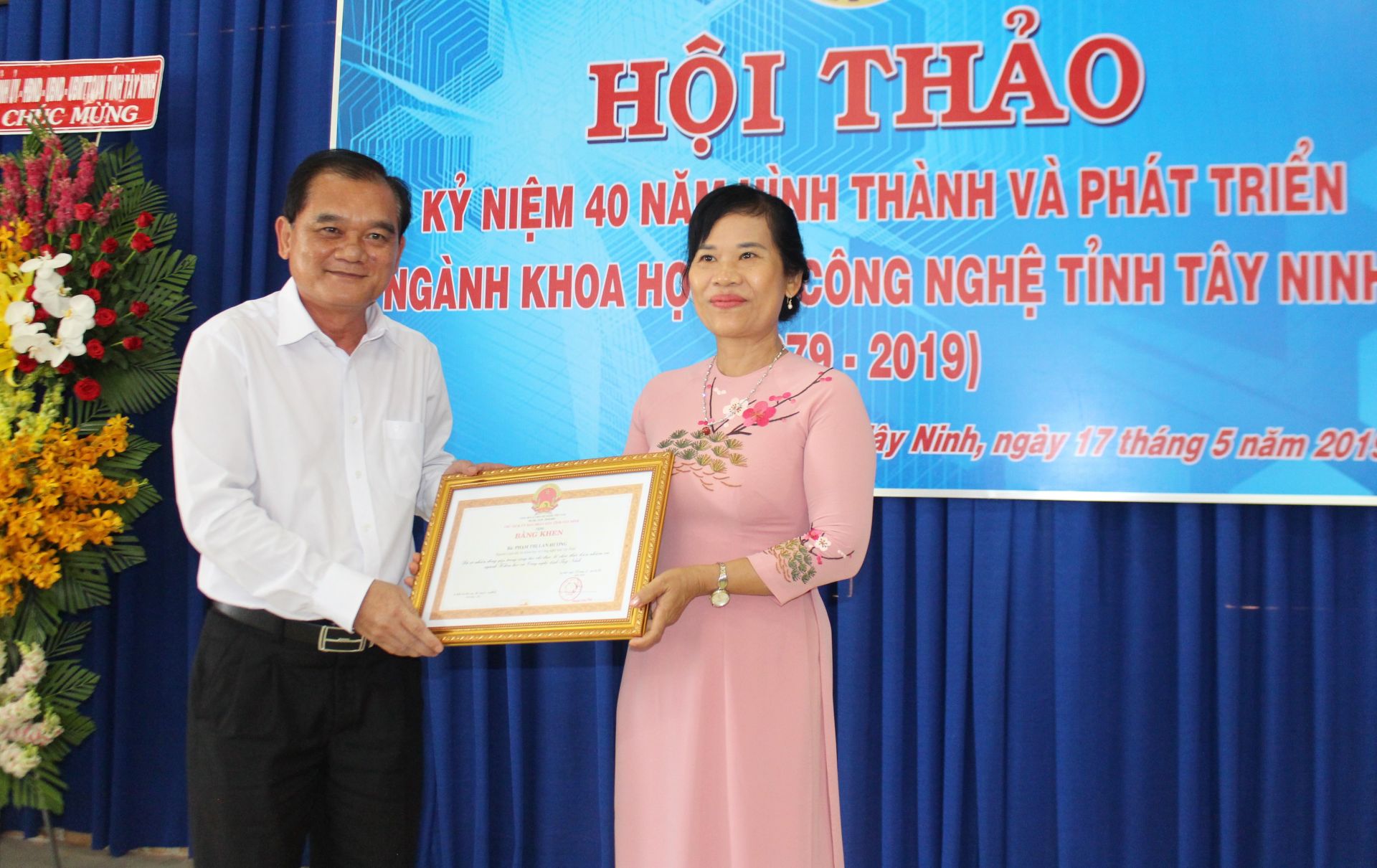 Ông Nguyễn Minh Tân- Phó Bí thư Thường trực Tỉnh uỷ trao bằng khen cho bà Phạm Thị Lan Hương- nguyên Giám đốc Sở Khoa học và Công nghệ.