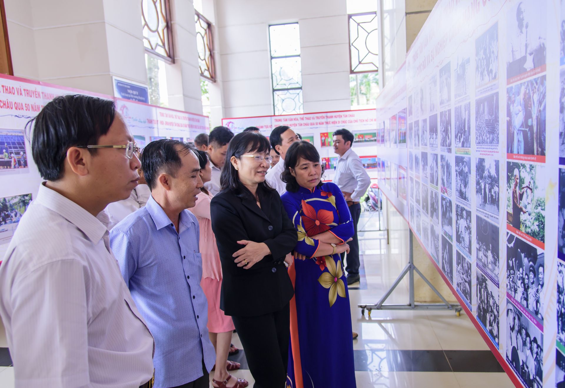 Các đại biểu tham quan triển lãm ảnh 50 năm thực hiện Di chúc Chủ tịch Hồ Chí Minh tại Tân Châu. Ảnh: Công Điều