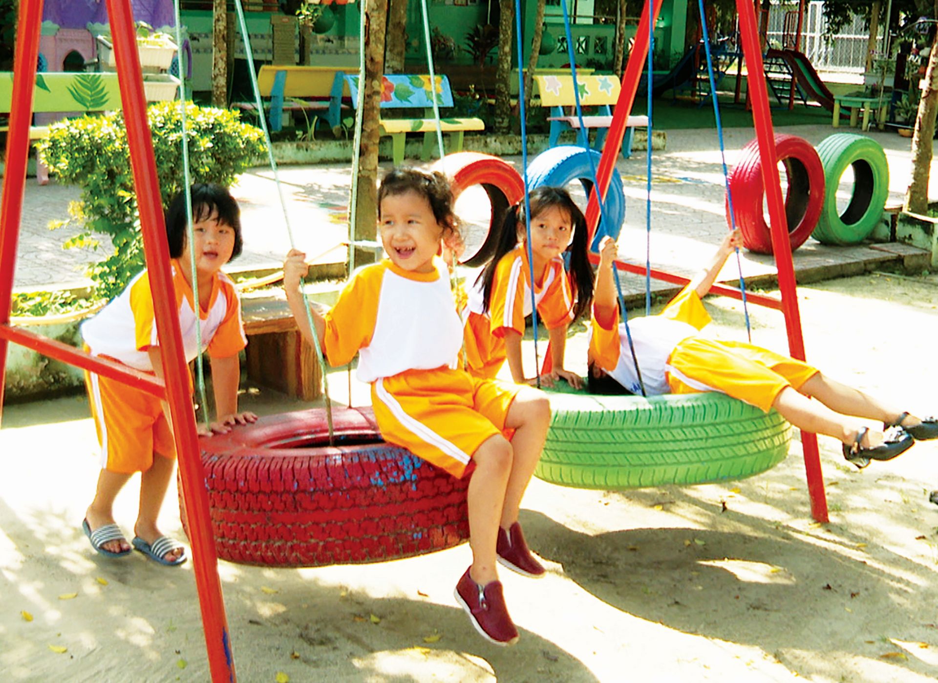 Khu vui chơi trẻ em được tái chế từ lốp xe tại Trường mầm non Long Hải, xã Trường Tây, huyện Hoà Thành.