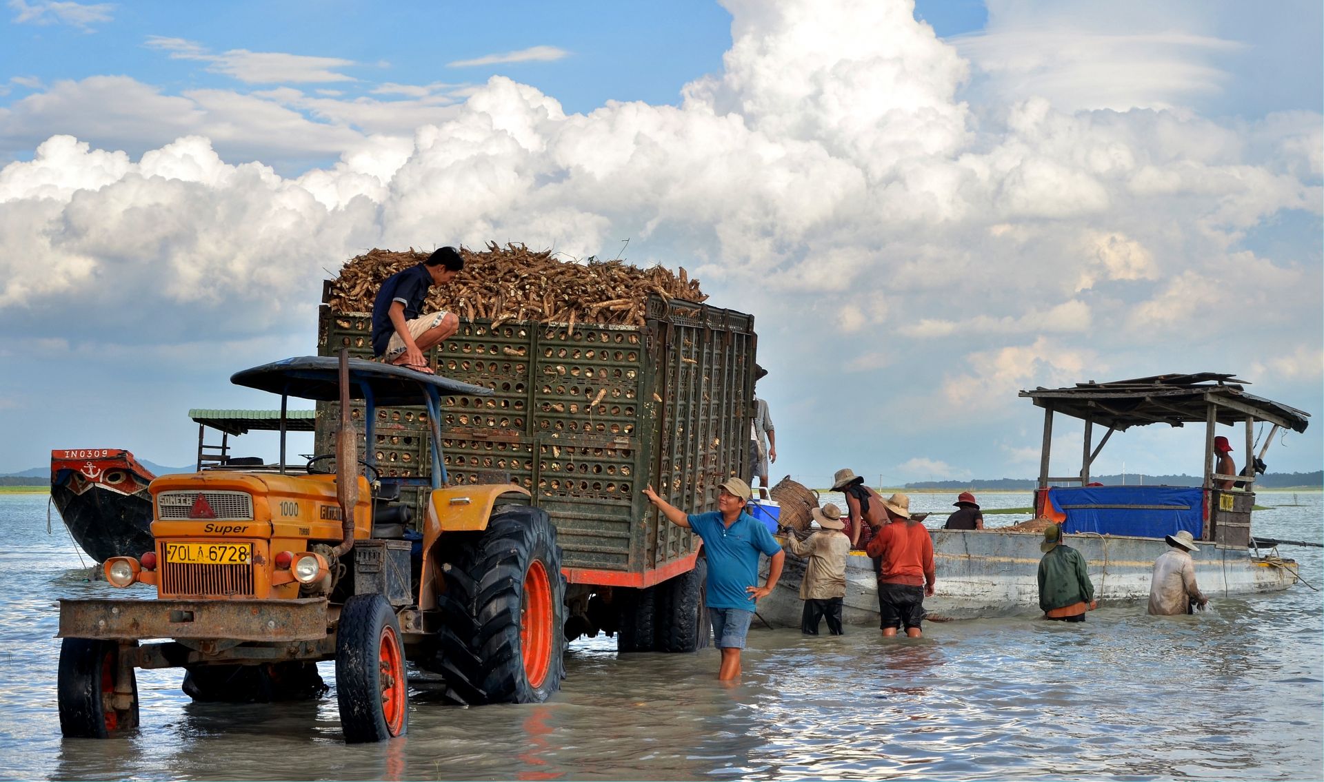 Trung chuyển mì thu hoạch từ đảo Nhím lên bờ hồ Dầu Tiếng. Ảnh: Đ.H.T