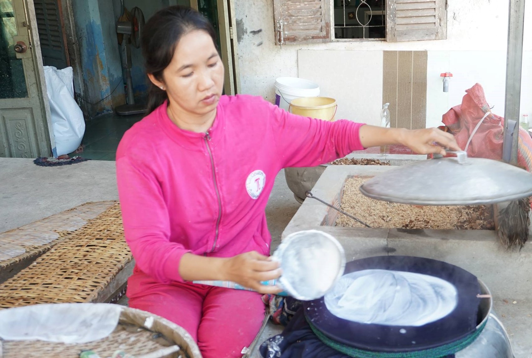 Tranh thủ thời gian rảnh tại nhà, chị Nhanh- ở khu phố Lộc Du mỗi ngày có thể tráng được 400- 500 bánh. Ảnh: Hồng Thắm