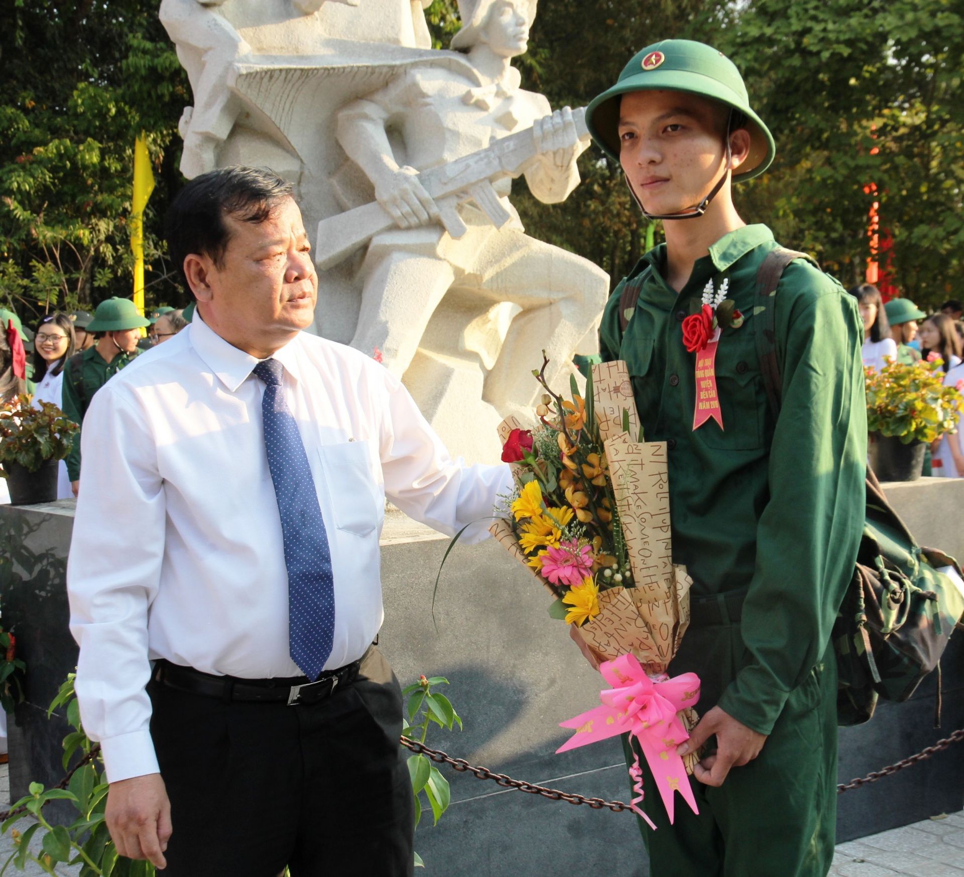 Chủ tịch UBND tỉnh Phạm Văn Tân tặng hoa cho thanh niên lên đường nhập ngũ. Ảnh: N.D