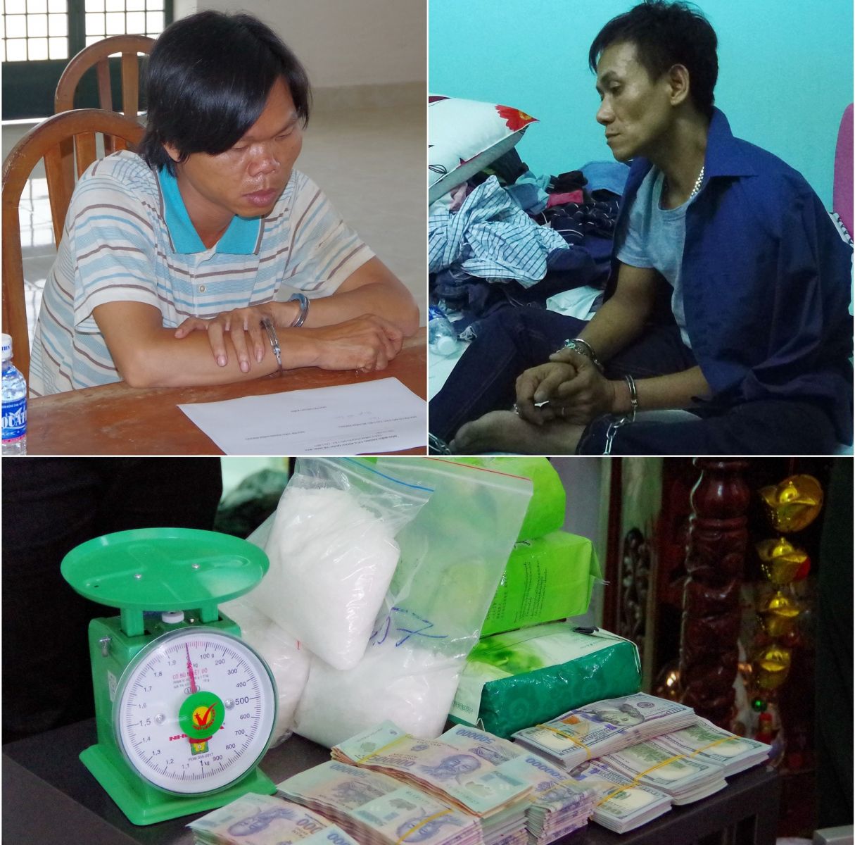 Hai đối tượng Huỳnh Văn Lâm và Choun Phi Rin cùng tang vật vụ án.