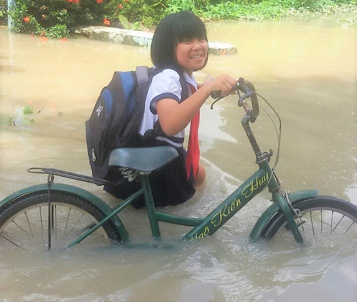 Nước ngập gần tới yên xe, học sinh phải xuống xe dắt bộ.