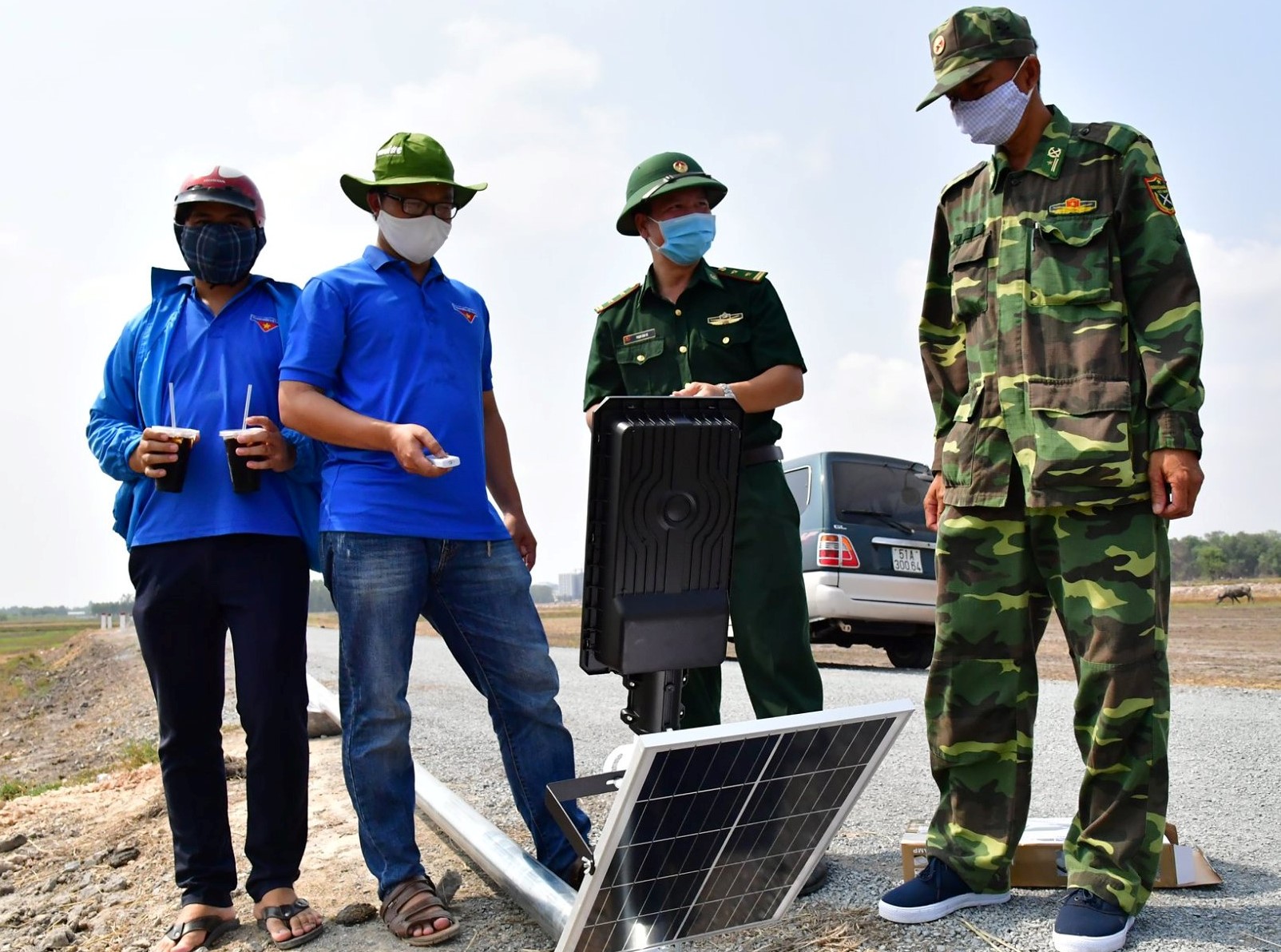 Đoàn viên, thanh niên hỗ trợ lực lượng Biên phòng lắp đặt đèn năng lượng mặt trời tại chốt phòng, chống dịch Covid-19 trên biên giới. (Ảnh: Lê Quân)