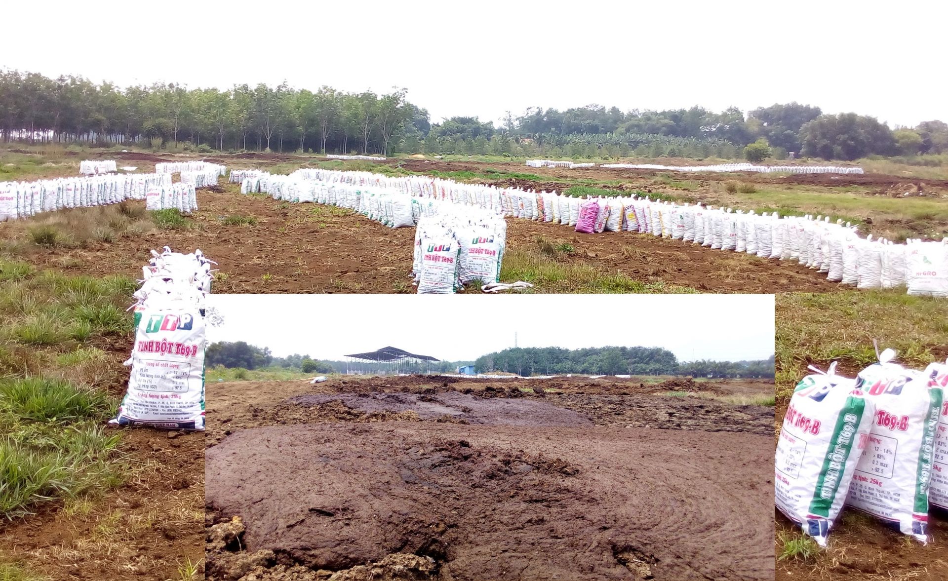 Phân bò phơi khô đã được nhân công cho vào hàng trăm bao tải (ảnh lớn). Một góc bãi phơi phân bò của Công ty Khải Nam (ảnh nhỏ).