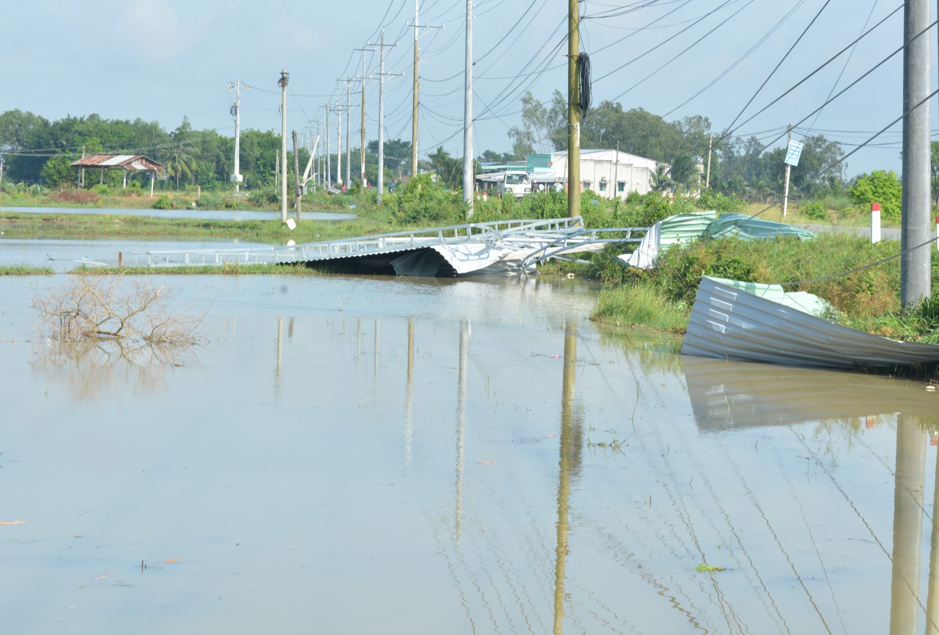 Mái che của hộ ông Lâm Tuấn Kiệt ở ấp Rừng Dầu rơi dưới ruộng nước.