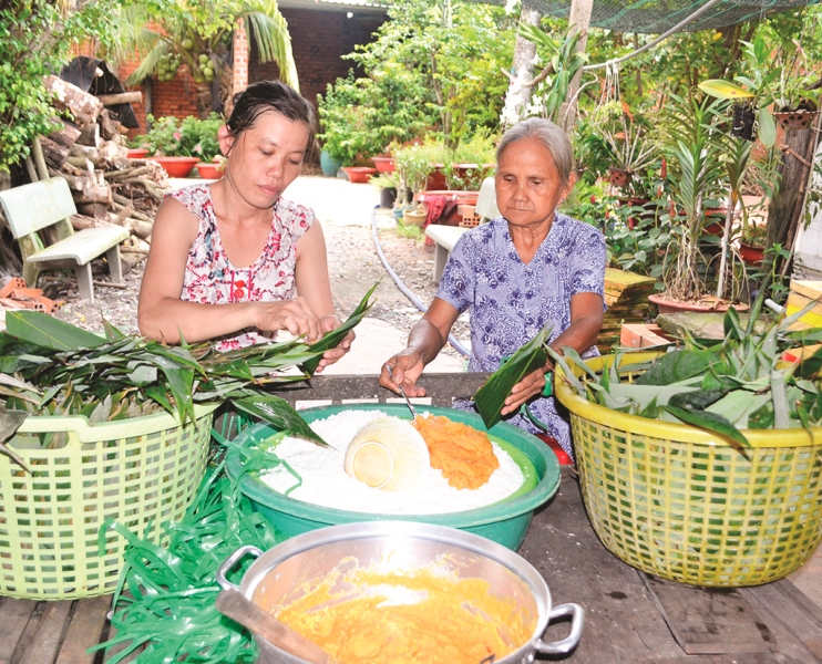 Chị Thơ và mẹ chồng gói bánh.
