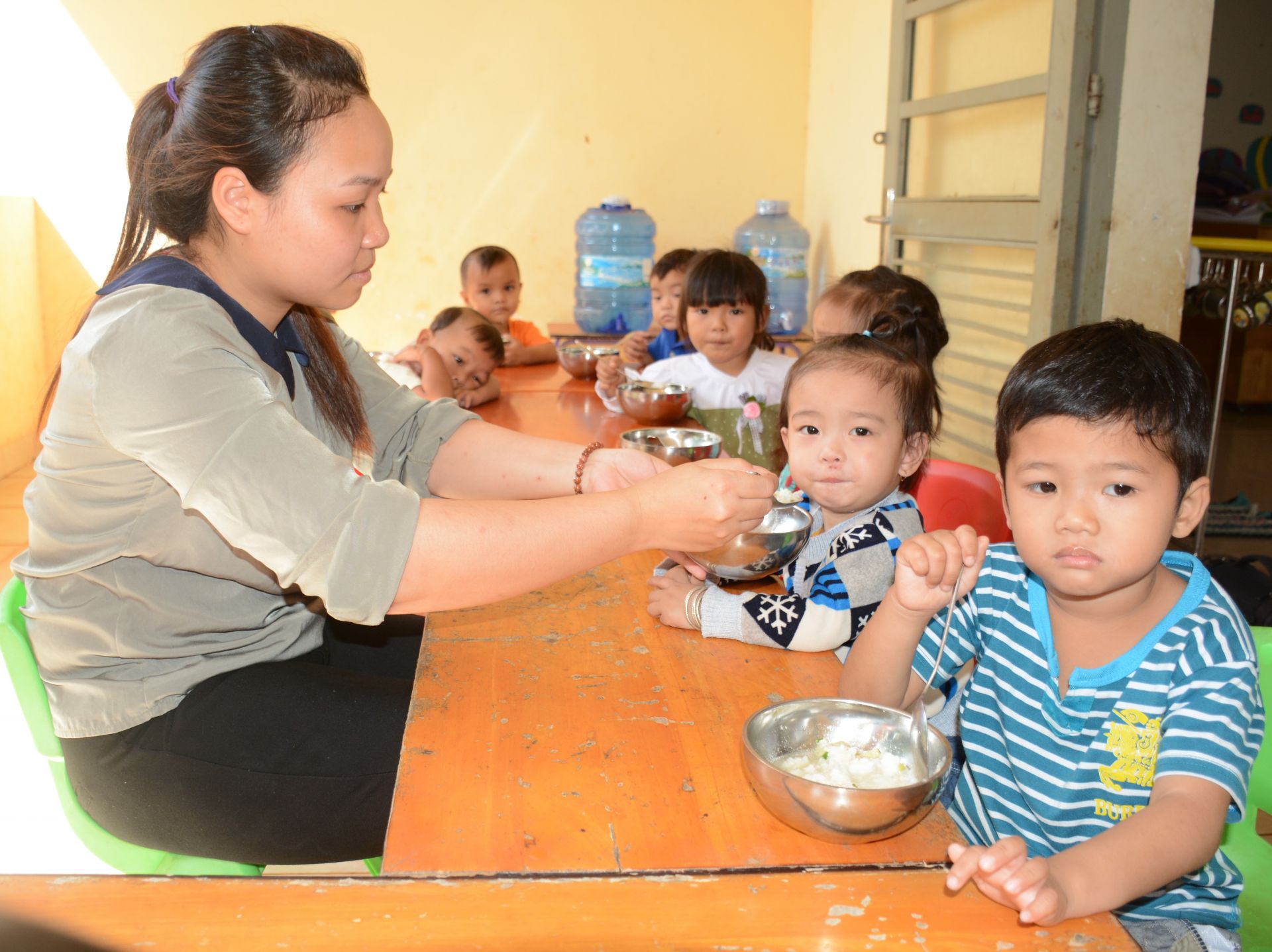 Giáo viên Trường mẫu giáo Chàng Riệc, xã Tân Lập, huyện Tân Biên cho trẻ ăn trưa.
