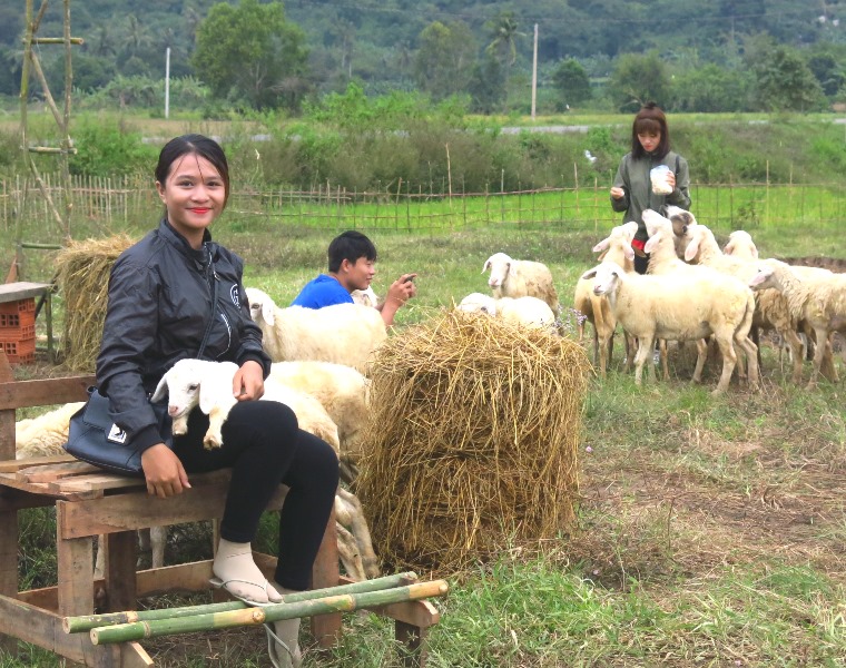 Nhiều bạn trẻ thích thú chụp ảnh với những chú cừu dạn dĩ dưới chân núi Bà Đen.