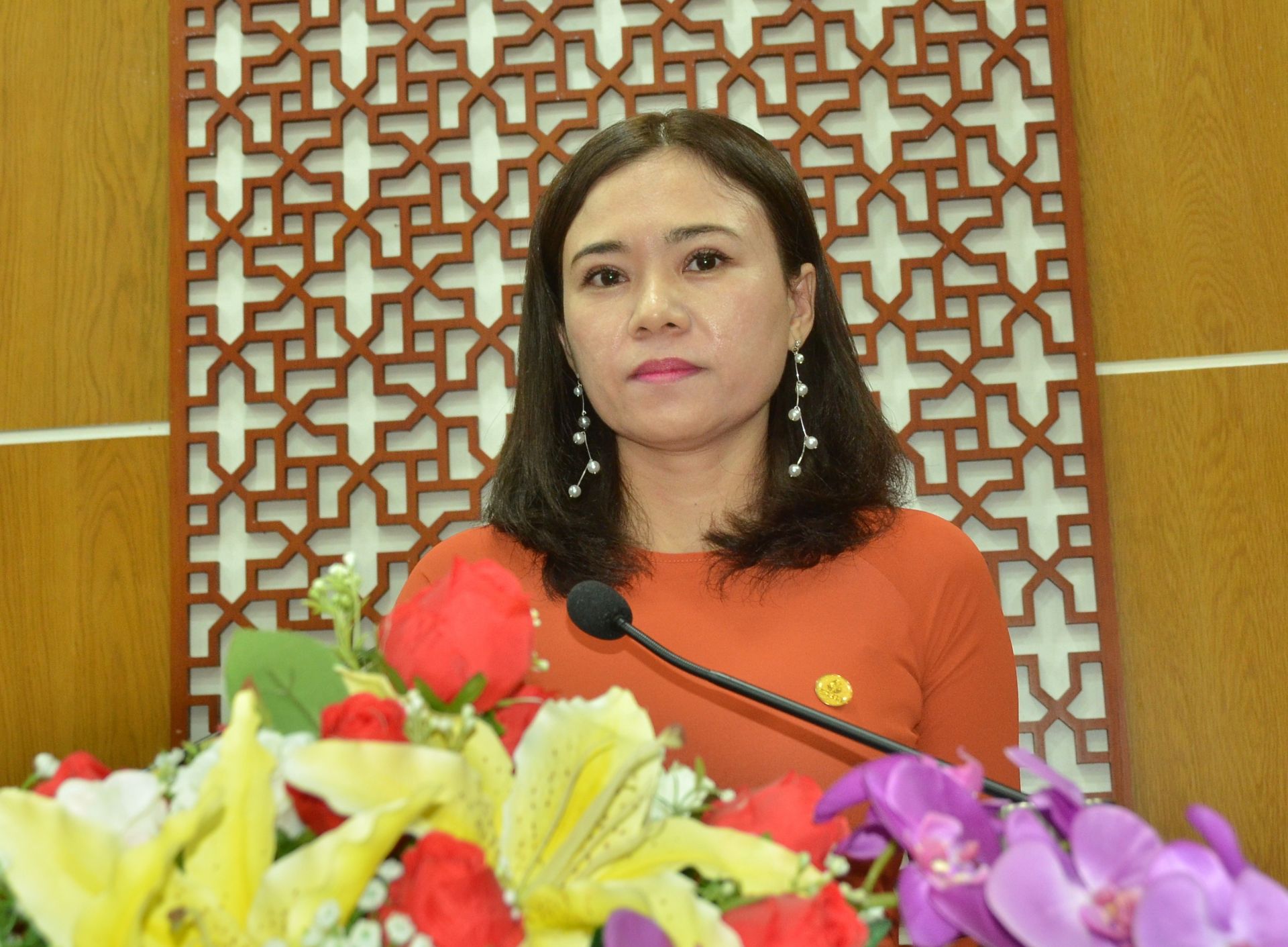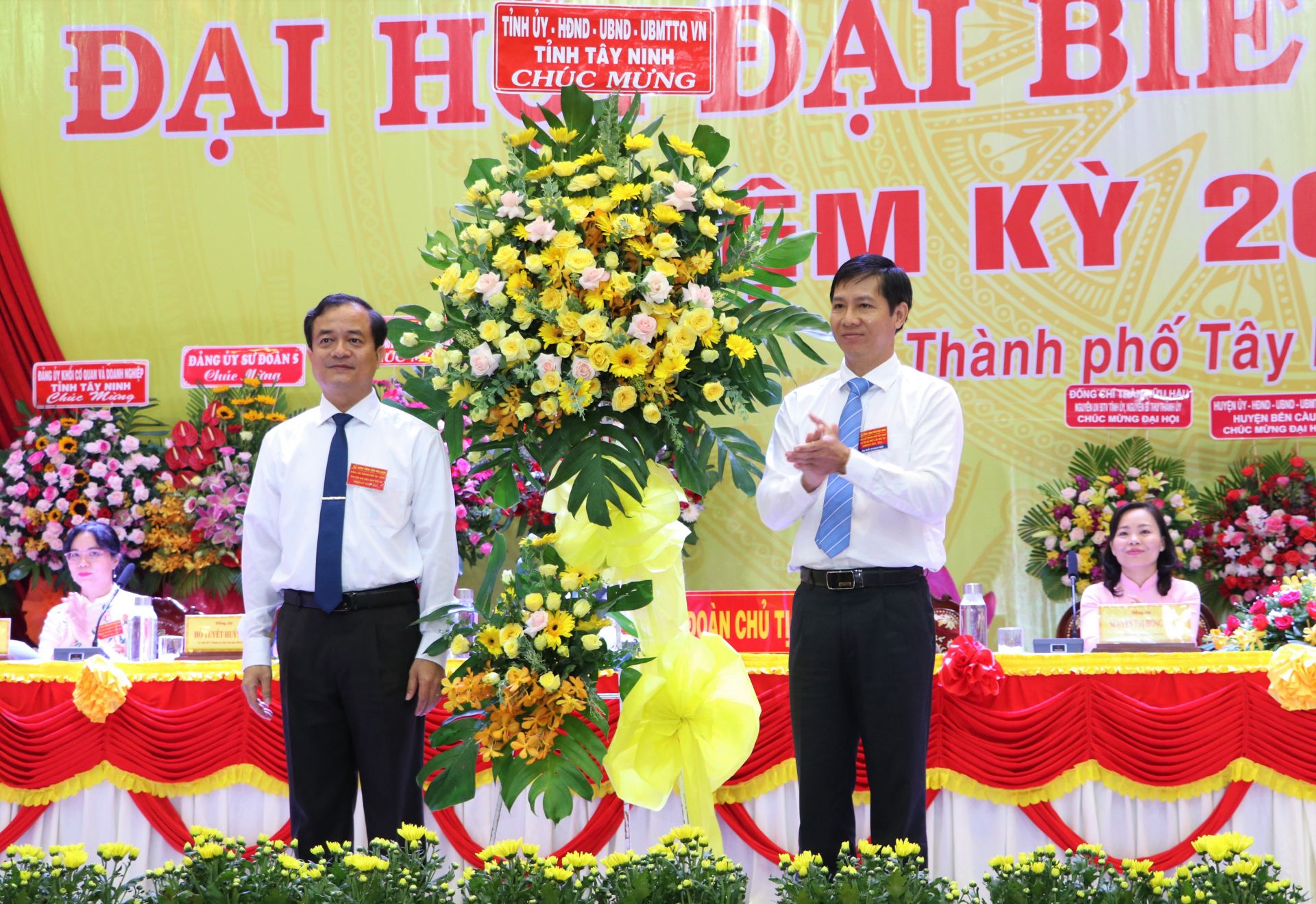 Phó Bí thư Thường trực Tỉnh uỷ Nguyễn Thành Tâm (bên phải) tặng hoa chúc mừng Ðại hội Ðảng bộ thành phố Tây Ninh.