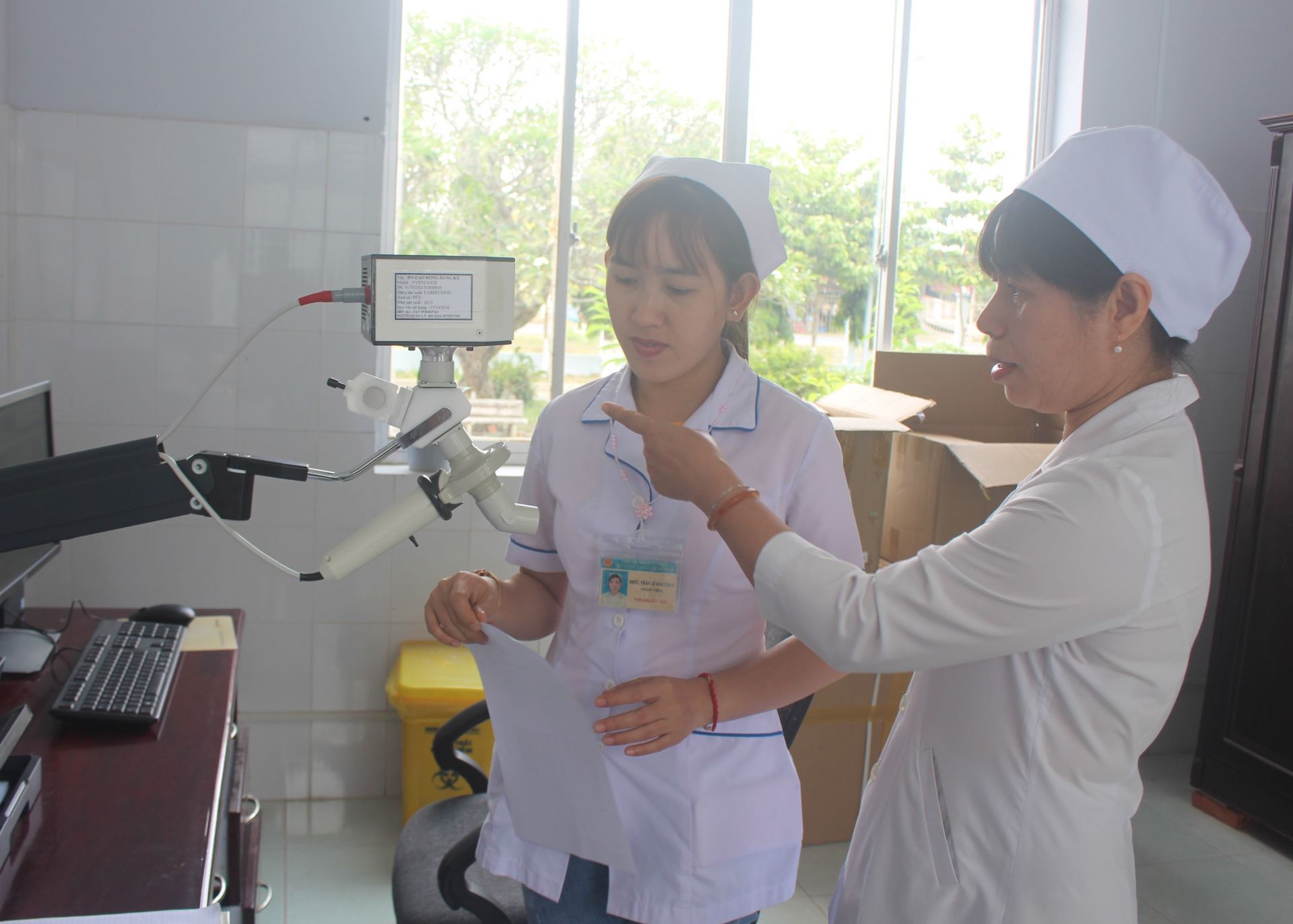 Nhân viên y tế thao tác với máy dao động xung ký.