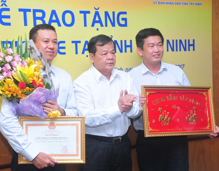 Ông Phạm Văn Tân (giữa) tặng Bằng khen, hoa và quà lưu niệm của UBND tỉnh Tây Ninh cho Công ty dịch vụ MobiFone khu vực 8.