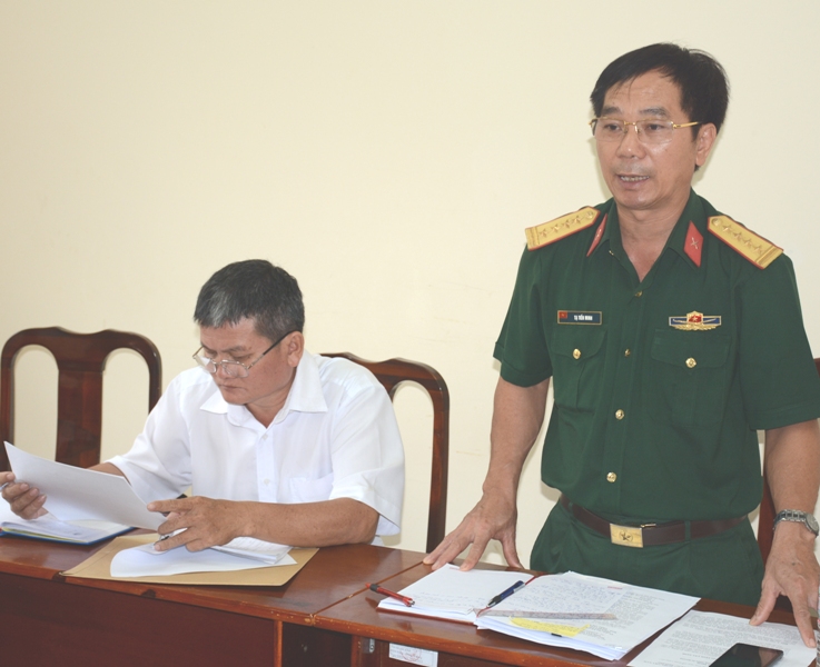 Đại tá Tạ Tiến Minh- Phó Chủ nhiệm chính trị Bộ CHQS tỉnh, trưởng đoàn công tác phát biểu tại UBND xã Tân Thành, huyện Tân Châu.