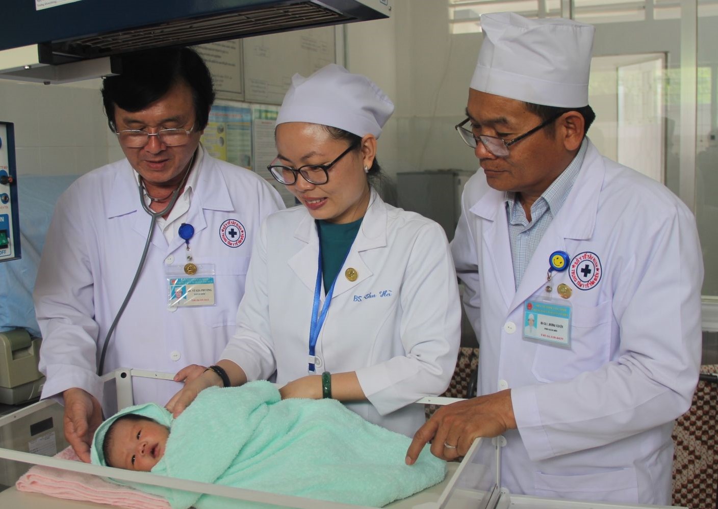 Bác sĩ Vũ Gia Phương- Giám đốc Trung tâm Y tế huyện Tân Biên (bên trái) thăm khám, theo dõi cháu bé bị bỏ rơi.
