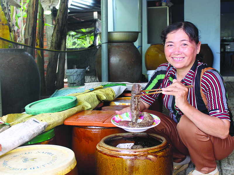 Bà Ẩn với sản phẩm mắm đồng của mình.