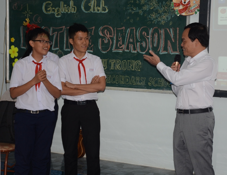 Bí thư Tỉnh uỷ Trần Lưu Quang trò chuyện bằng tiếng Anh với học sinh Trường THCS Lý Tự Trọng.
