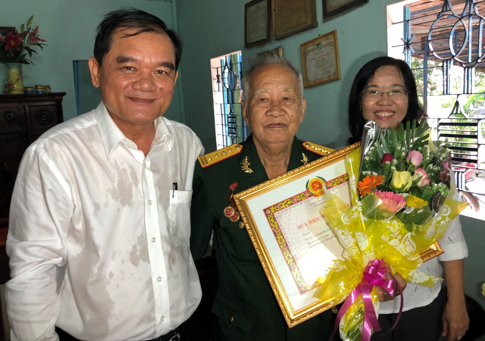 Phó Bí thư Thường trực Tỉnh uỷ Nguyễn Minh Tân trao Huy hiệu 70 năm tuổi Ðảng cho đảng viên Nguyễn Văn Sen.