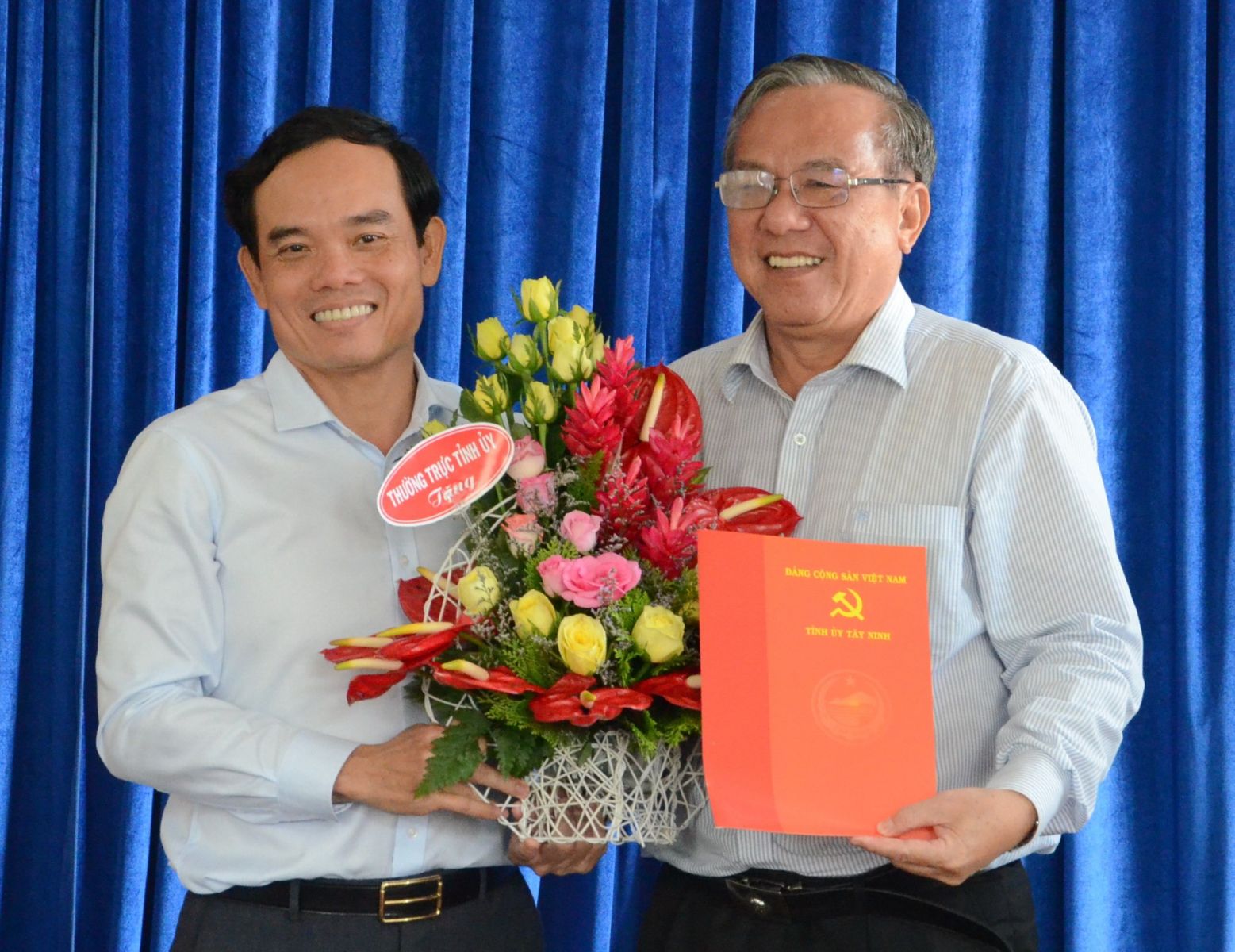 Bí thư Tỉnh uỷ Trần Lưu Quang trao quyết định nghỉ hưu cho ông Huỳnh Văn Quang, Chủ tịch Uỷ ban Mặt trận Tổ quốc Việt Nam tỉnh.
