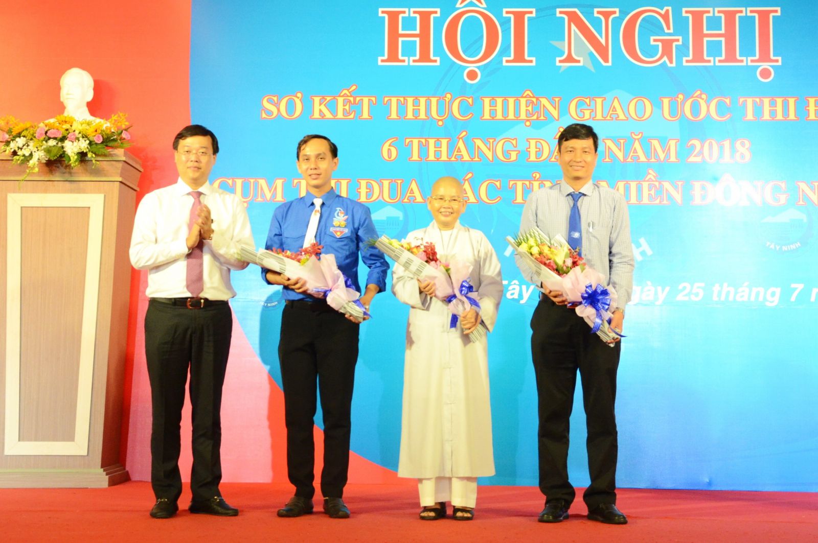 Bí thư thứ nhất Trung ương đoàn Lê Quốc Phong tặng hoa chúc mừng các cá nhân, tập thể tiêu biểu của Cụm trong phong trào thi đua yêu nước.